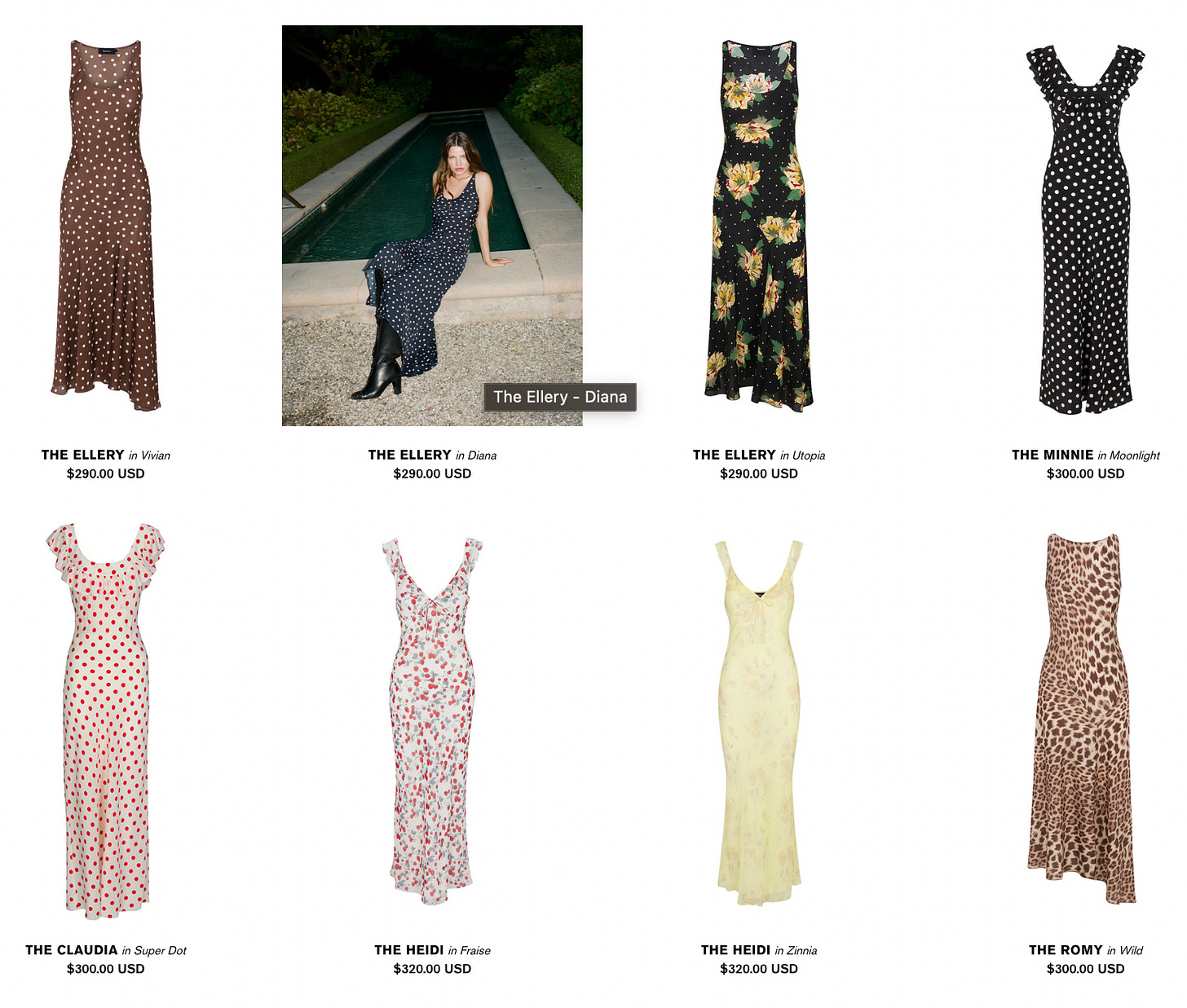 Their dresses (and the evocative product shots) sell an irresistible fantasy: Imagine slipping on single-layered silk post-everything-shower, sun kissed from an afternoon in the French Riviera heat, hair still damp but twirling effortlessly into product-free curls. You glide into skimpy sandals and head out on a leisurely stroll to an early dinner reservation when your girlfriend snaps a casually stunning candid film photo of you, glowing orange sky illuminating your clear bare skin. I mean, say less, I’m already packing my bags.