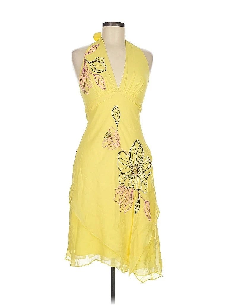 Floral detail yellow halter dress, $91. Needs to be spinning on a dance floor to ABBA stat.