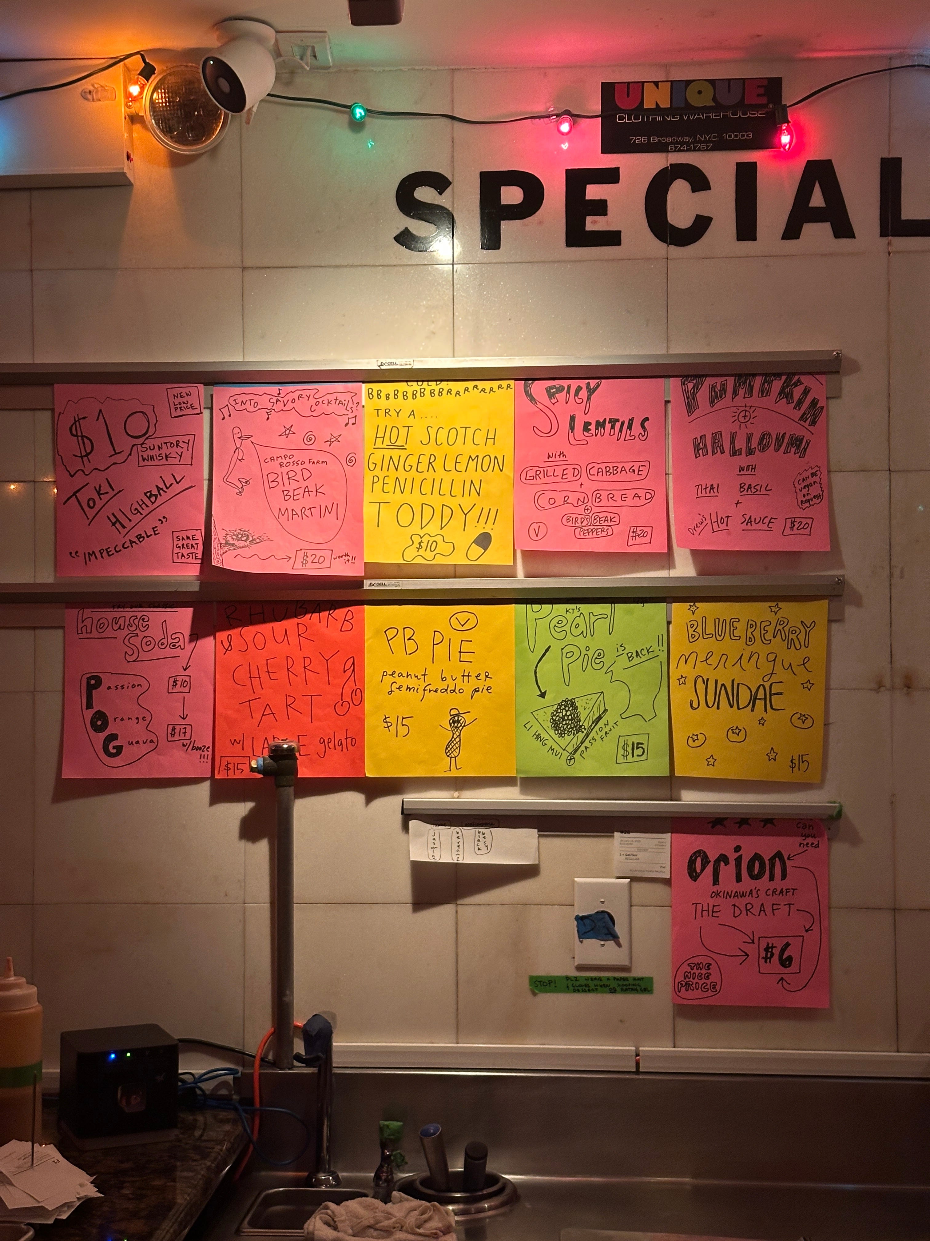 A few blocks north, borrowing a similar citrusy palette, the specials wall at Superiority Burger is a welcome boost of serotonin. The peanut butter Semifreddo pie will make you dance like the baseball-capped peanut who advertises it.