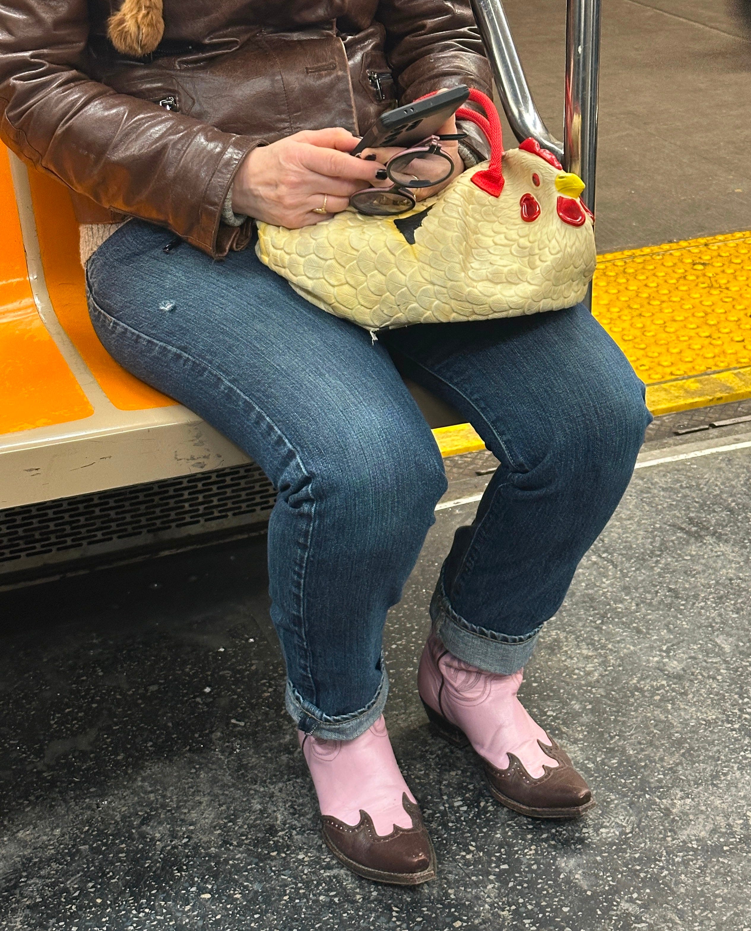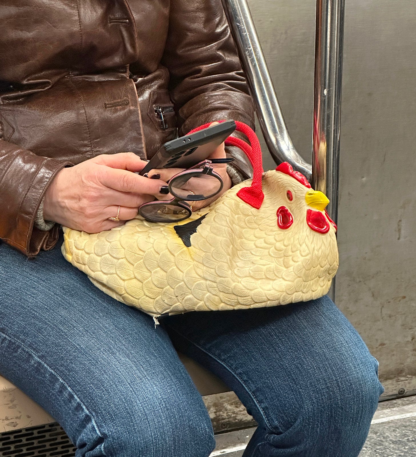 The rubber chicken, bravely navigating the 2 train on a weekday evening, brought so much joy to my day I wish I would’ve spoken to her anyway. At least to thank her — “Excuse me, sorry, I just wanted to thank you for carrying a rubber chicken purse. I’m going to think about this a lot.”
