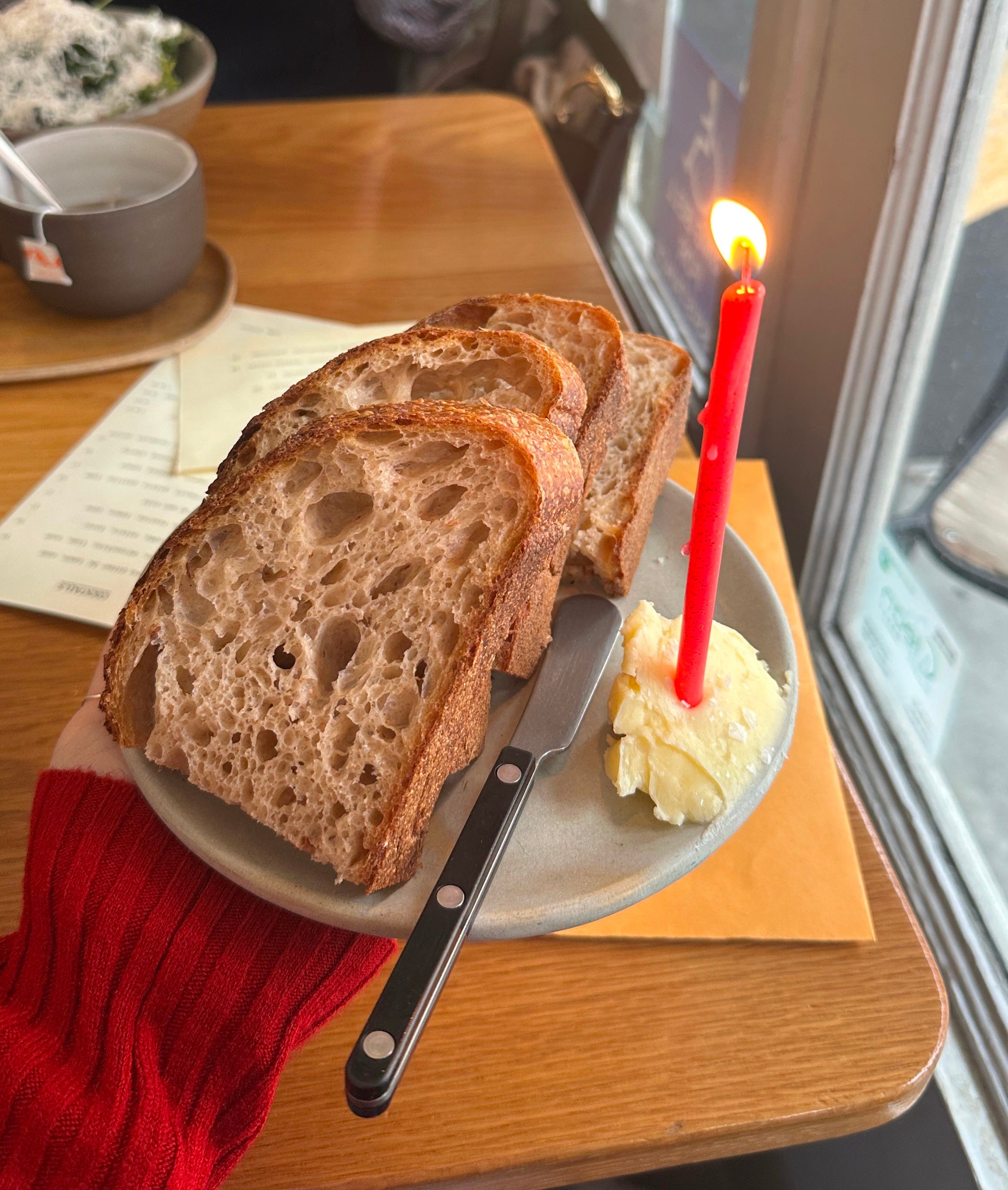 The waitress noticed it was my birthday (was the tiara that Maya brought me too obvious?) and stuck a glittery pink candle into a slab of salted butter for me. A girl after my own heart.