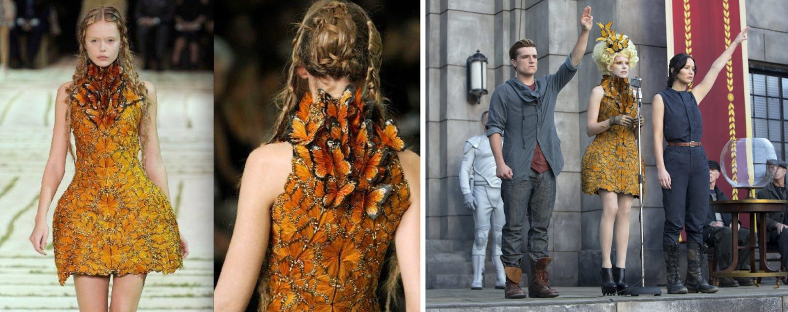 The Alexander McQueen piece on the right went in a less literal direction, opting for beaded beetles draped under a leather corset. Designer Sarah Burton has a bit of a history with bugs of other kinds as well—you may recognize her Spring/Summer 2011 monarch butterfly dress worn in the Hunger Games by fashion icon Effie Trinket.