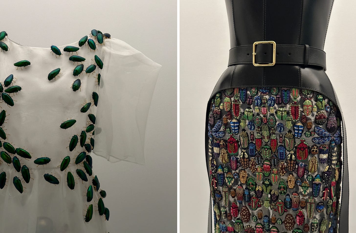 The first time I visited this exhibit, months before conceiving that I might write about beetles here, I couldn’t shut up about the dress on the left. It’s a silk organza piece swarmed by jewel beetles from New York label Dauphinette founded by Olivia Cheng. These real beetles were sustainably harvested in Thailand, according to the Costume Institute. They come from an orchid farm where Cheng also sources flowers for jewelry.