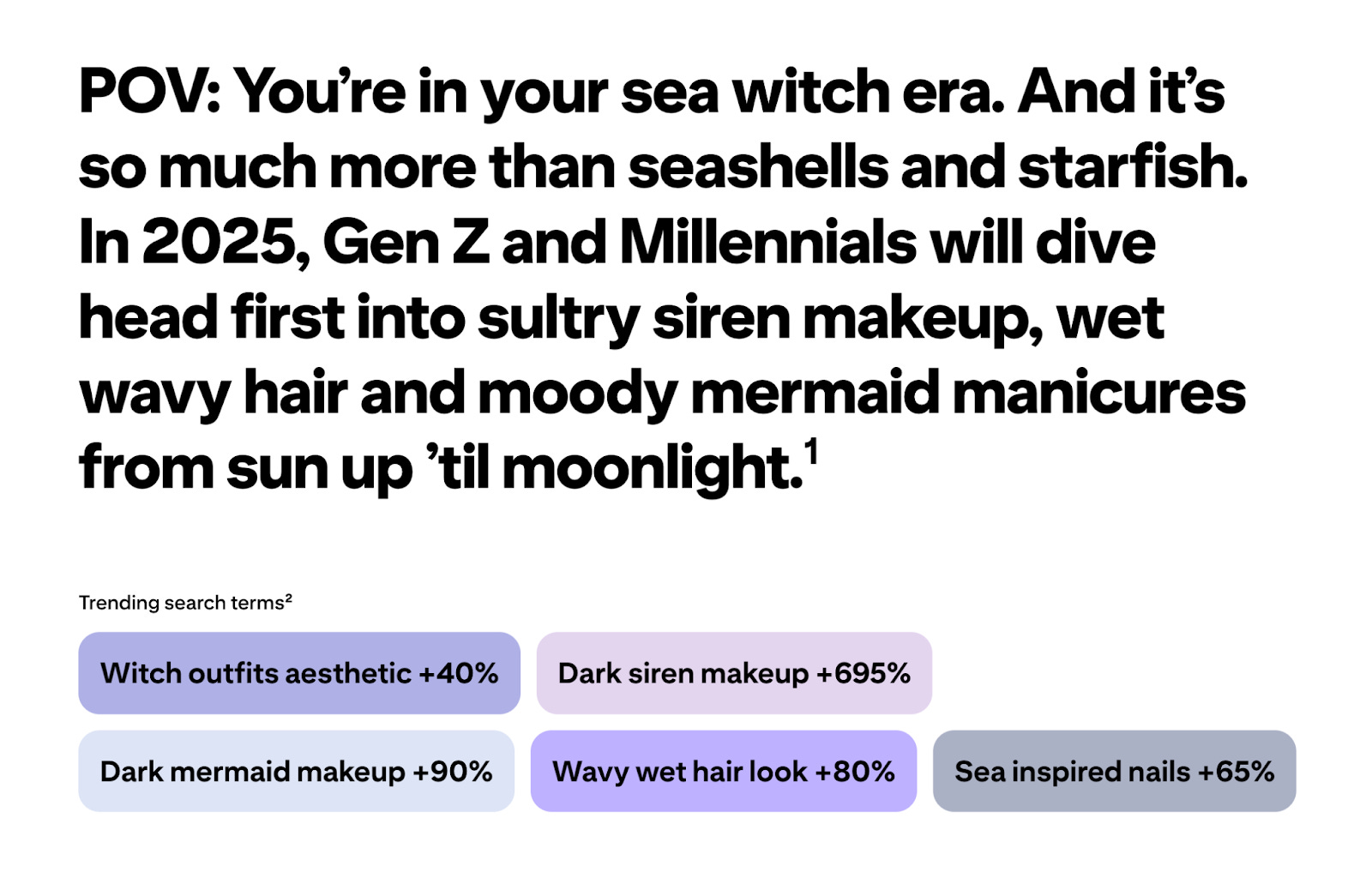 On the surface, Pinterest’s trend prediction of “sea witchery” reflects a desire to escape into the ocean, free from troubles on land. Perhaps escaping a feudal lord’s tirades? Upon diving into the sea, past the break of the waves, the witches will tell you: they’ve seen this all before.