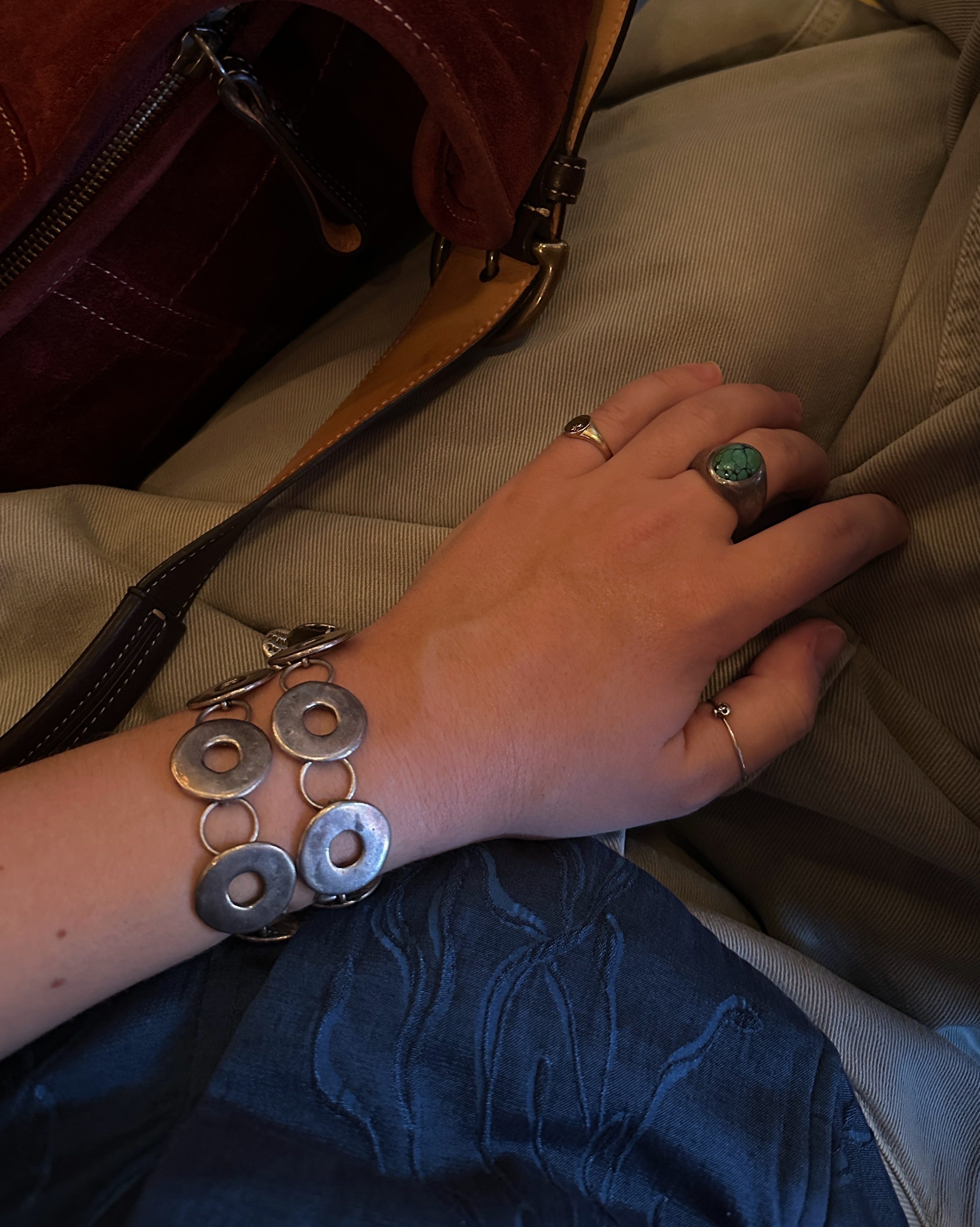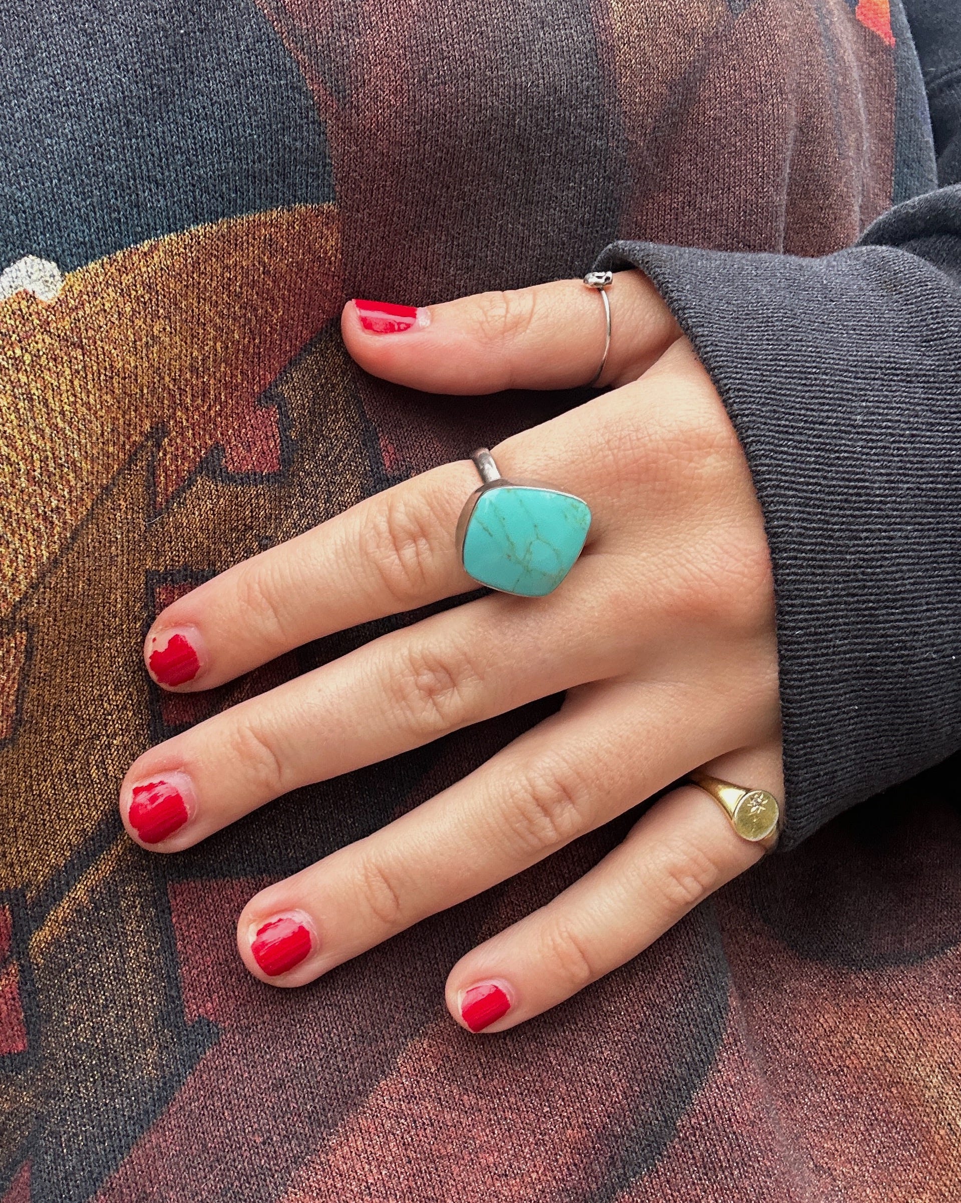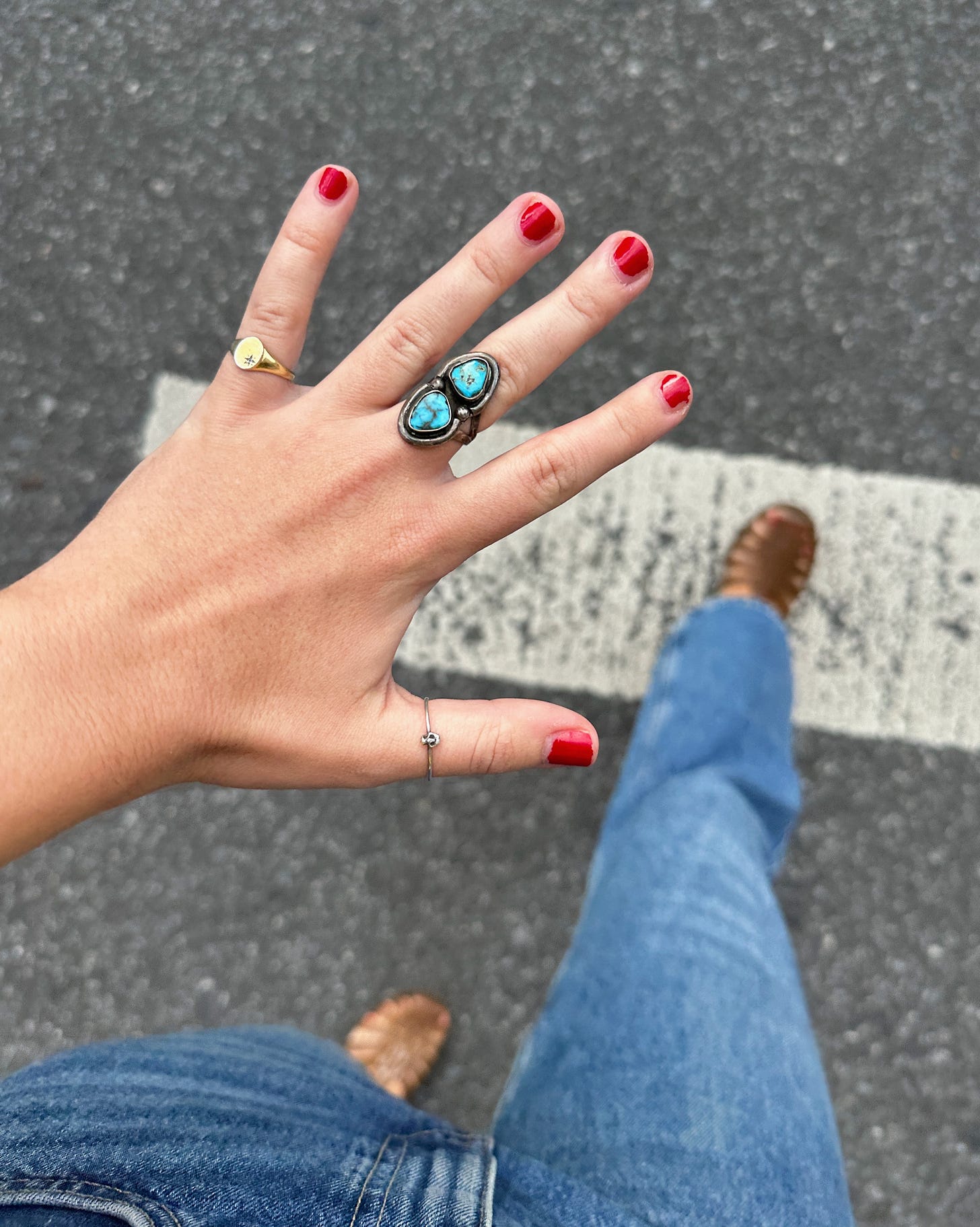 My grandmothers on both sides have passed down a dozen or so turquoise pieces purchased from Indigenous artists through the years, a few of which stay in constant rotation in my ring stack. There’s always a tinge of western influence in how I dress thanks to my Phoenician roots — the rings being an effortless conduit of southwestern flair.