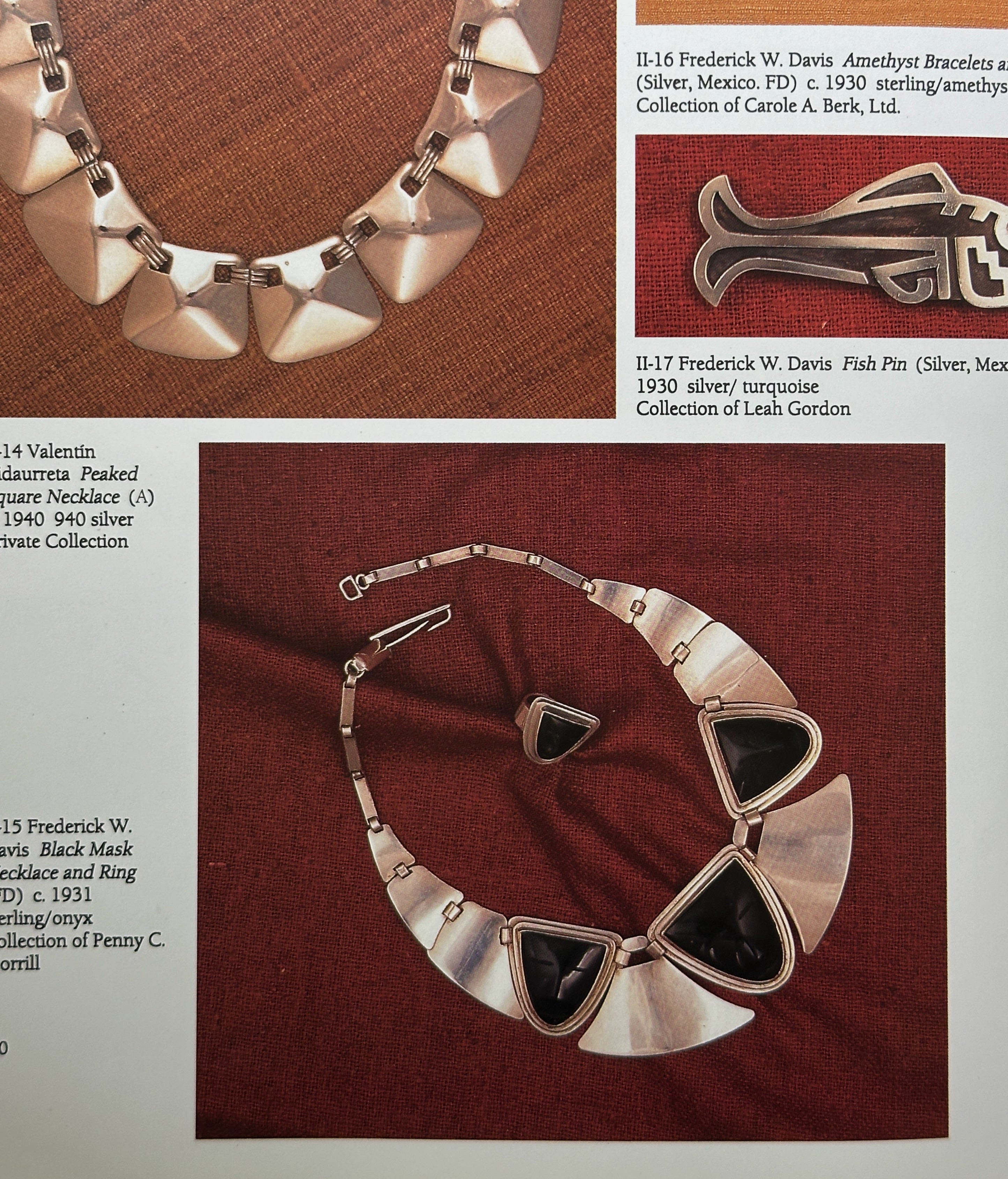 The book details the artistry and workshop of Hector Aguilar, who operated the Taller Borda starting in 1939, highlighting his mastery of silver and the other artists who flourished under his leadership. Pieces from his workshop were heavily influenced by Aztec motifs and often featured stones like onyx, malachite, and amethyst.