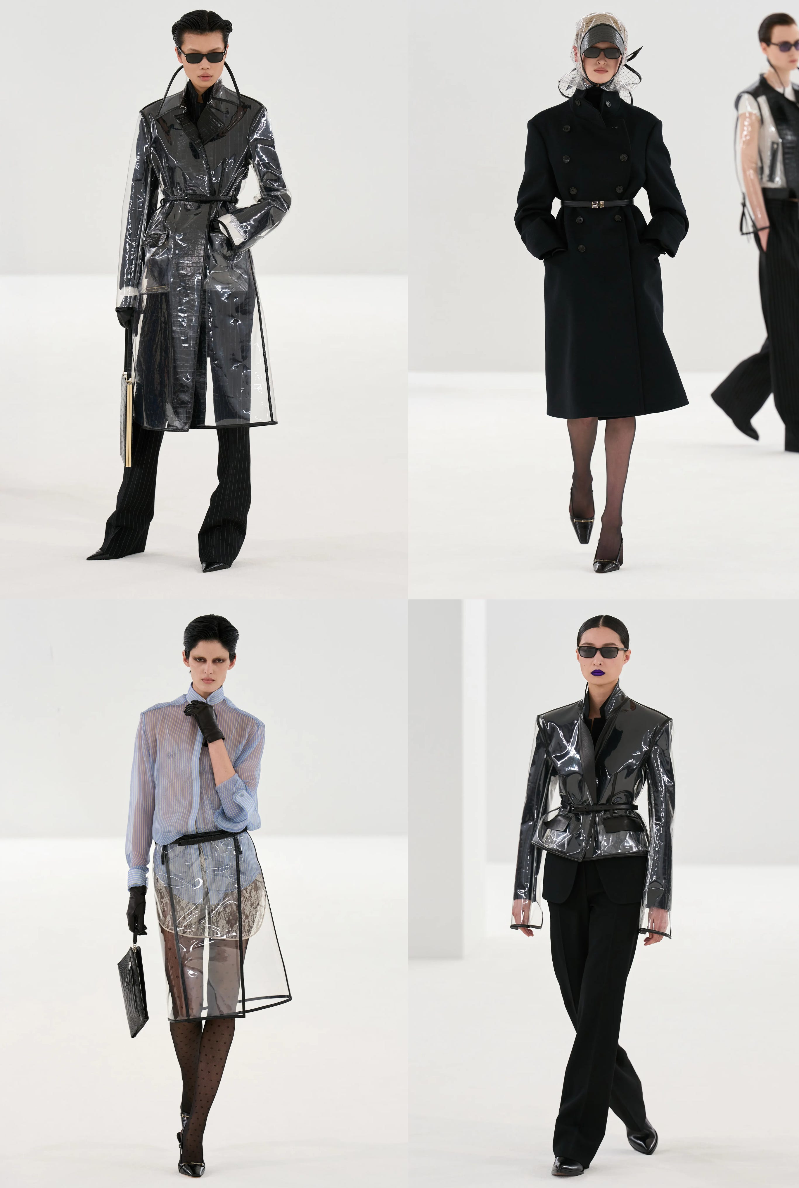 ★ Famously a sucker for see-through skirts and a brunette with a red lip, this look was tailor-made in a lab to give me heart palpitations. The show is a love letter to contrast, no better exhibited than in this look: an opaque black hole threatening to swallow her face, somehow working in harmony with sticky plastic exposing everything below the belt.