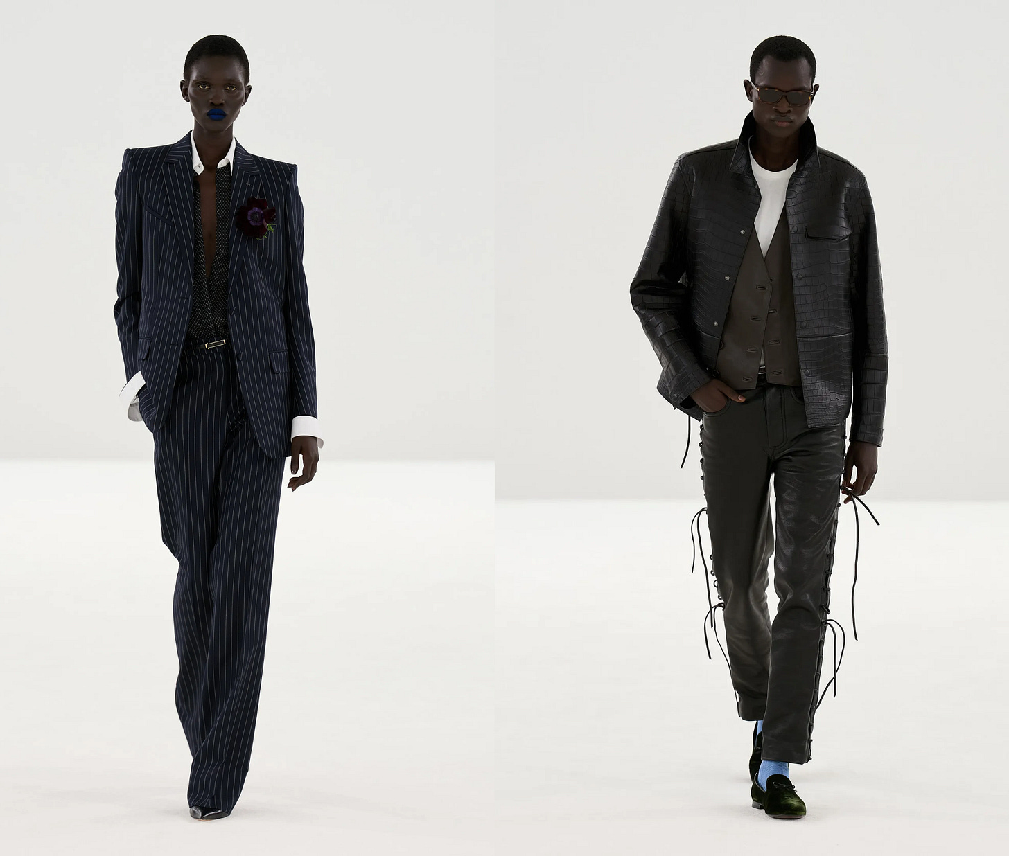 This collection blew me away — perhaps most of all because I wasn’t expecting it to. I always have the highest hopes for Prada, I expect posh glamour at Chanel, sculpture won’t shock me at Schiaparelli, but for some reason I was caught off guard by the Tom Ford rain coats dripping in sex. Silly me.