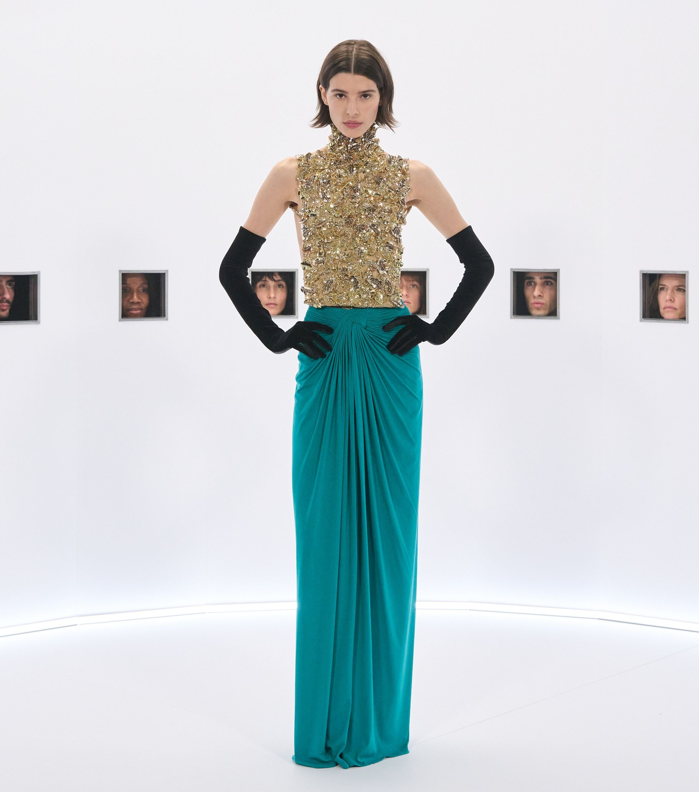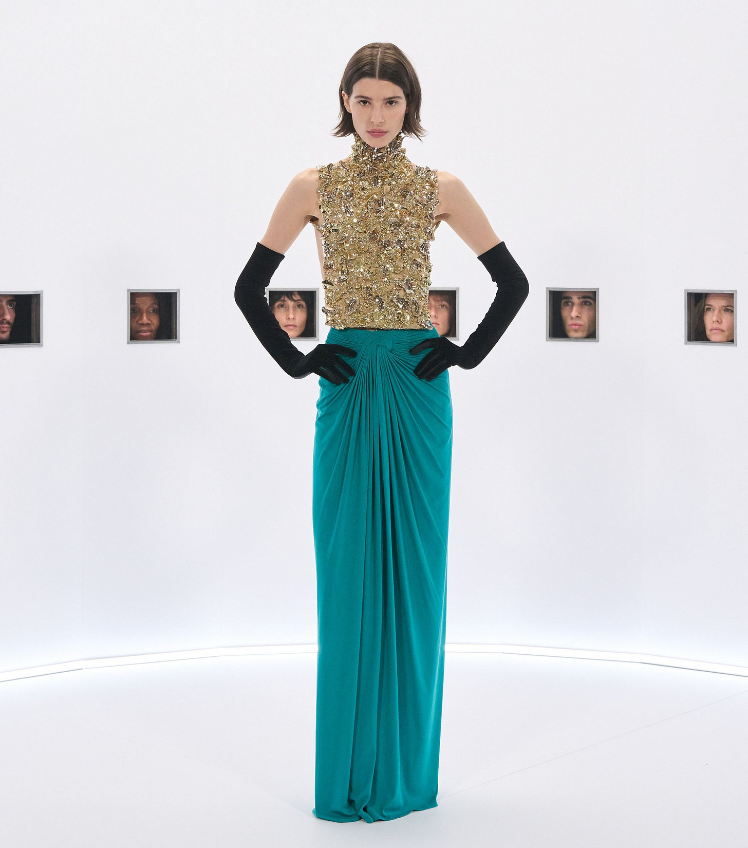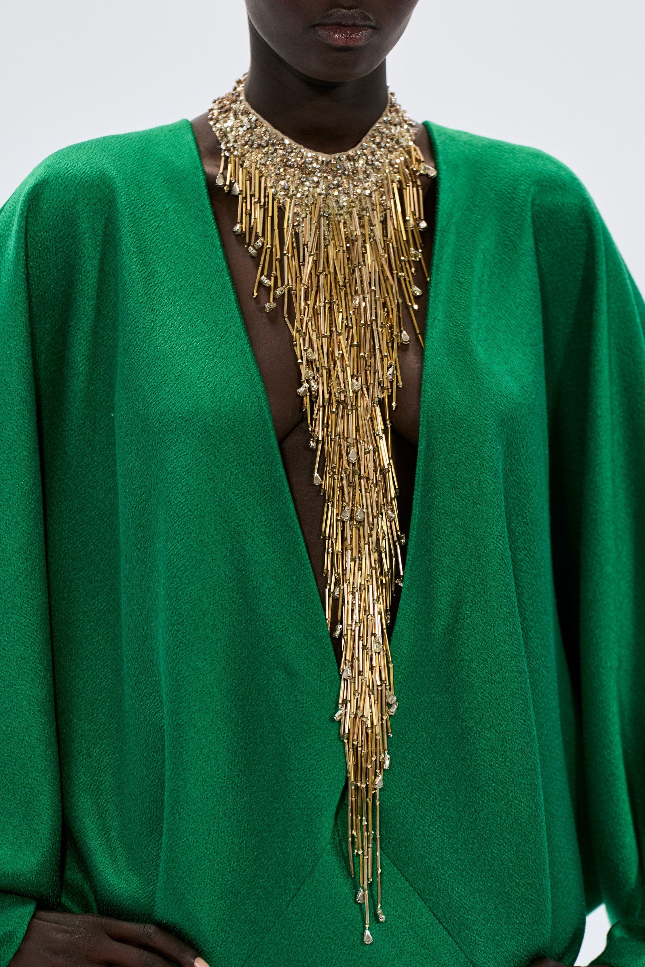 ★ This beaded necklace cascading down the model’s chest like a gold waterfall is almost blindingly luxurious. A bright, deep pool of emerald draped around it, and the two pieces mingle on her body like the sexiest singles at a hotel bar.