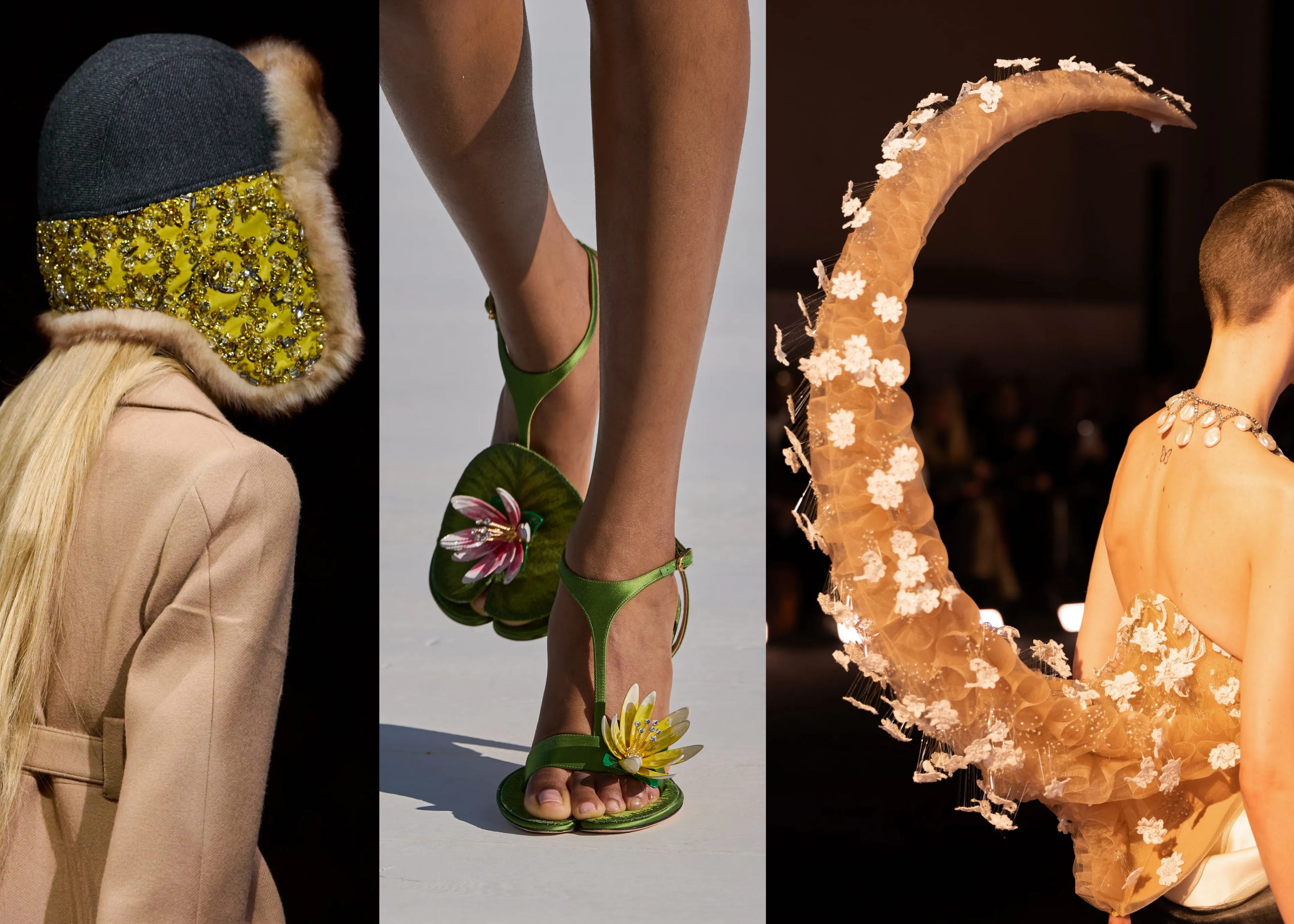 But a crucial fight against fascism is the championing of ART!, so we rage on, zooming in at max capacity on the Schiaparelli scorpion and Dior’s lily pad shoes and the Miu Miu bejeweled fur trapper hats. In dark moments, it’s nice to turn toward something that sparkles.