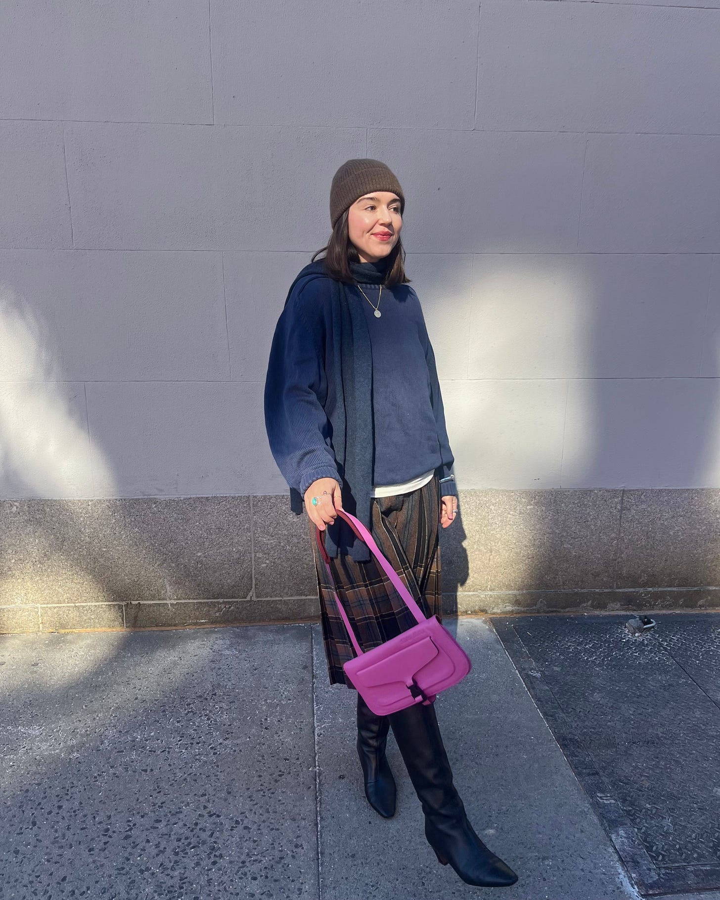 Under icy grey skies wrapped in wind streams like frozen ivy, I need a pop of pink like I need a Vitamin D supplement. A little contrast is proof of life, and a little leather accoutrement the color of grocery store cupcake frosting sweetens the deal.