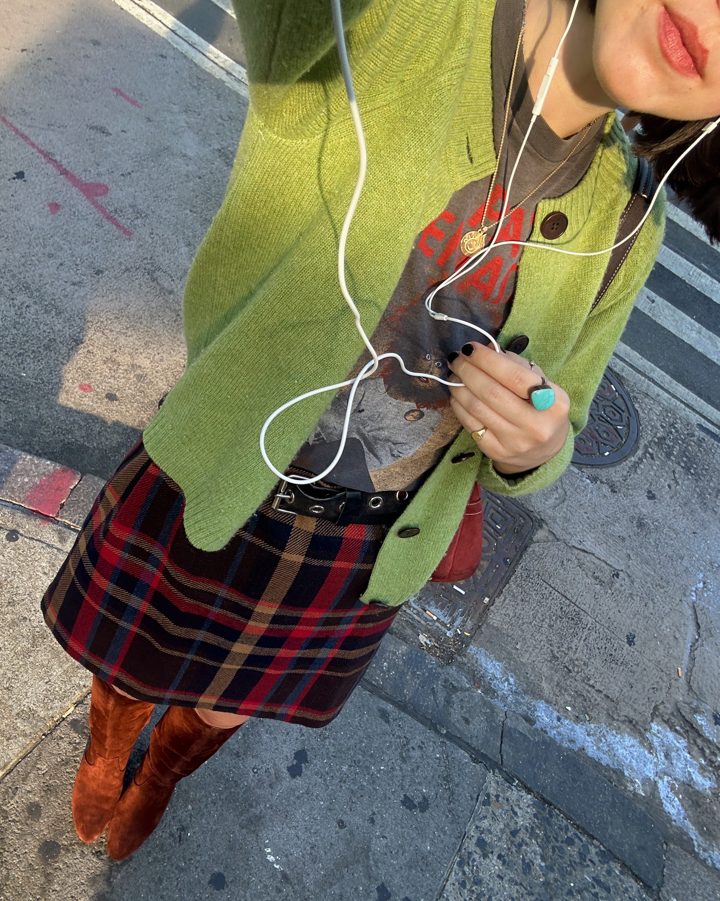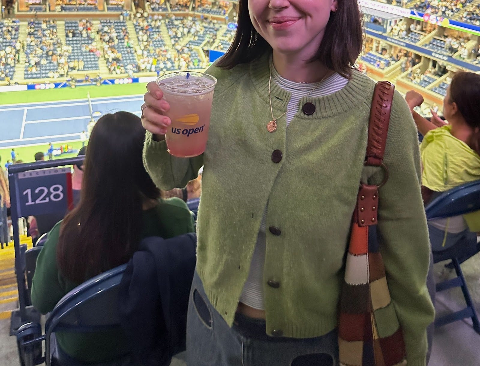 I dressed in reverence to the star of the evening, the tennis ball itself, in a green wool sweater from TOAST. I haven’t been able to peel this vintage denim Marc Jacobs skirt off my body recently — there’s nothing that screams fall transitional outfit more than comfortable cotton hitting right below the knee. The denim has a subtle warm tone that feels very unmistakably autumn to me. This patchwork vintage Lucky Brand bag is a fall staple and one of my most used eBay finds of all time, and I brought it here because, frankly, I had a lot of shit to carry.