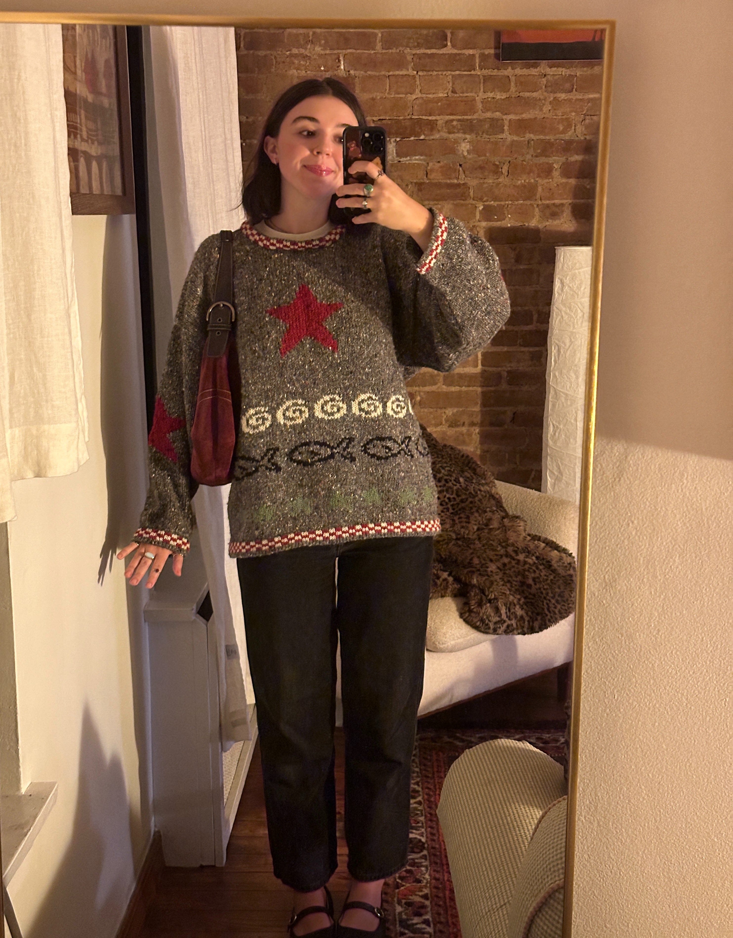 After a painfully hot and delicious shower, a giant bowl of beans for dinner, and a 2-hour sit on the couch, I resurrected to head downtown for a friend’s show. The evening air was chilly and crisp. Sweaters stored under the bed were gnawing at their enclosures to come out. I obliged and pulled on a vintage sweater I snapped up in London earlier this year — her first American fall, they grow up so fast!