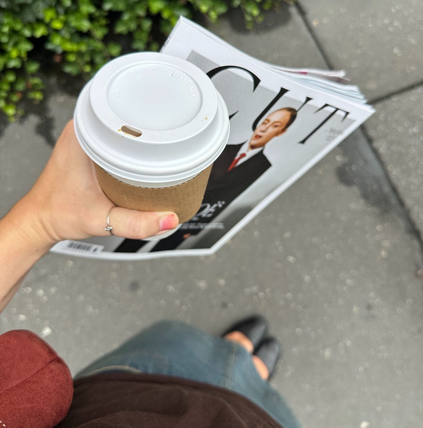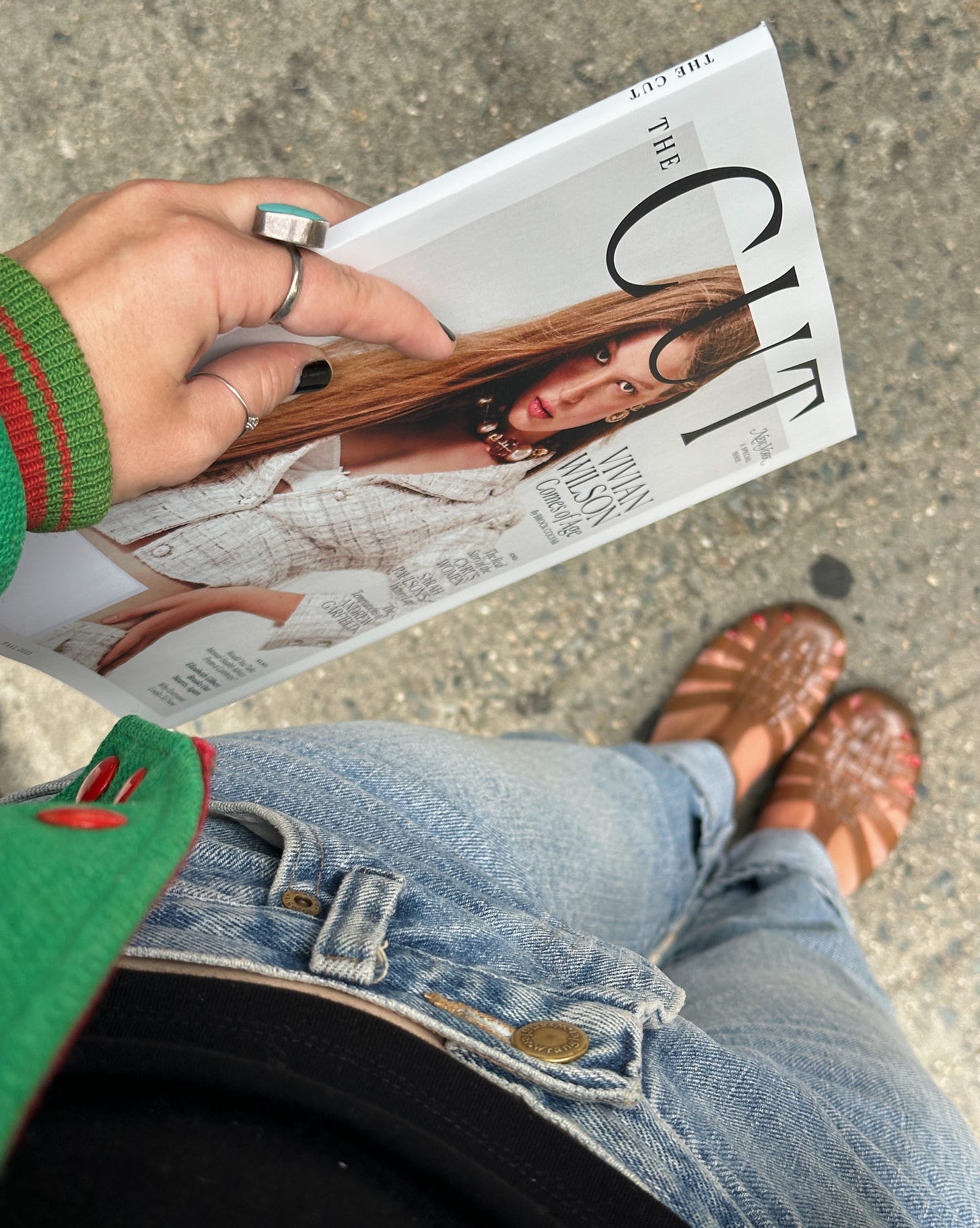 I came armed in the same denim skirt from the night before (maybe I slept in it, how would you know) and a Royel Otis t-shirt I bought at their show this past spring. Without the foresight to bring a purse large enough to carry the magazine, I opted for this vintage burgundy suede Coach number and carried the mag between my fingers until they cramped to hell.