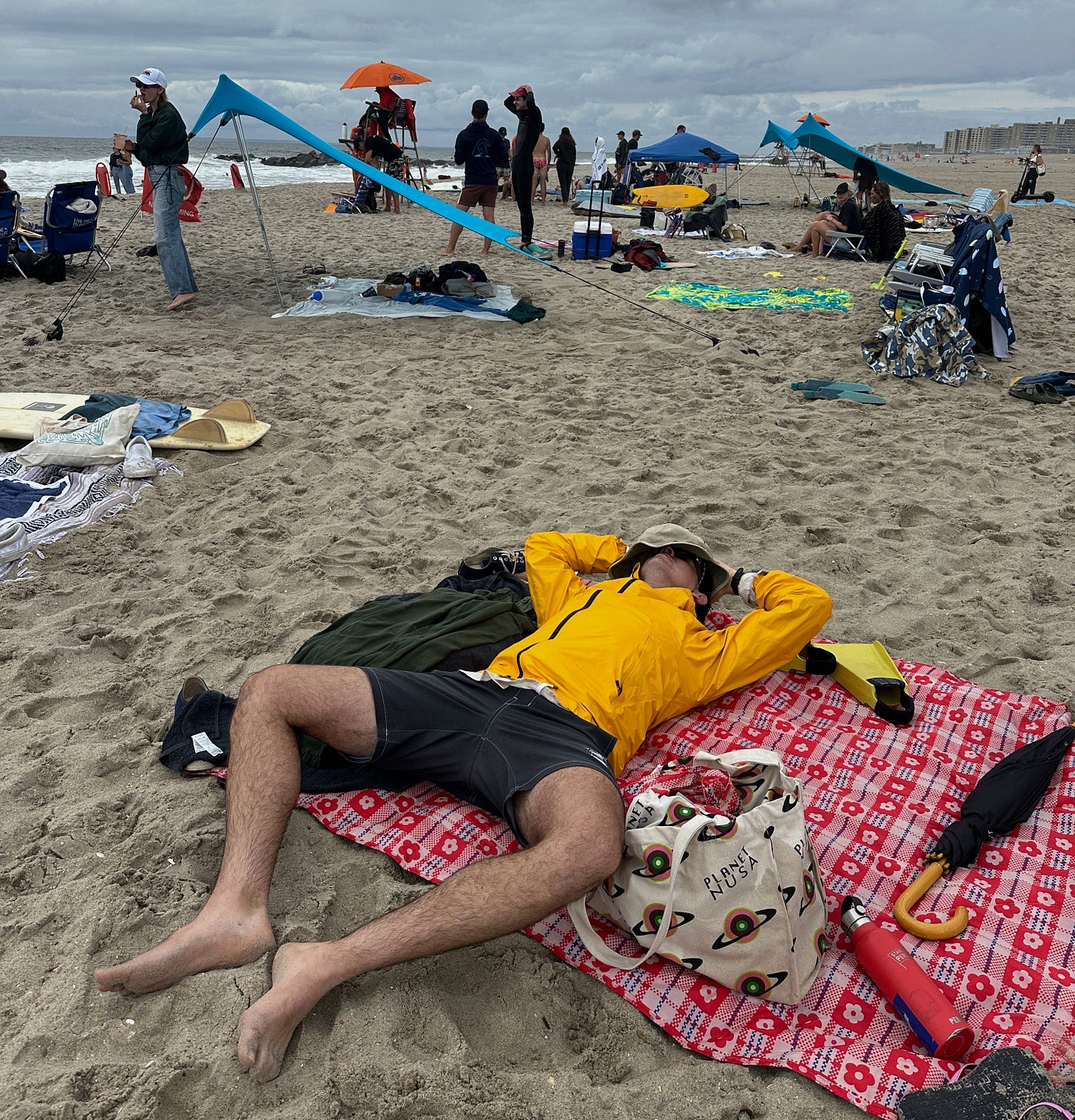 Lucky for us all, it started pouring rain just before his first heat! Never before have I been so wet next to the ocean without having dipped in even a toe. He and I were both drenched through the morning, but wildly different athletic efforts went into getting each of us there (re: no athletic effort for me).