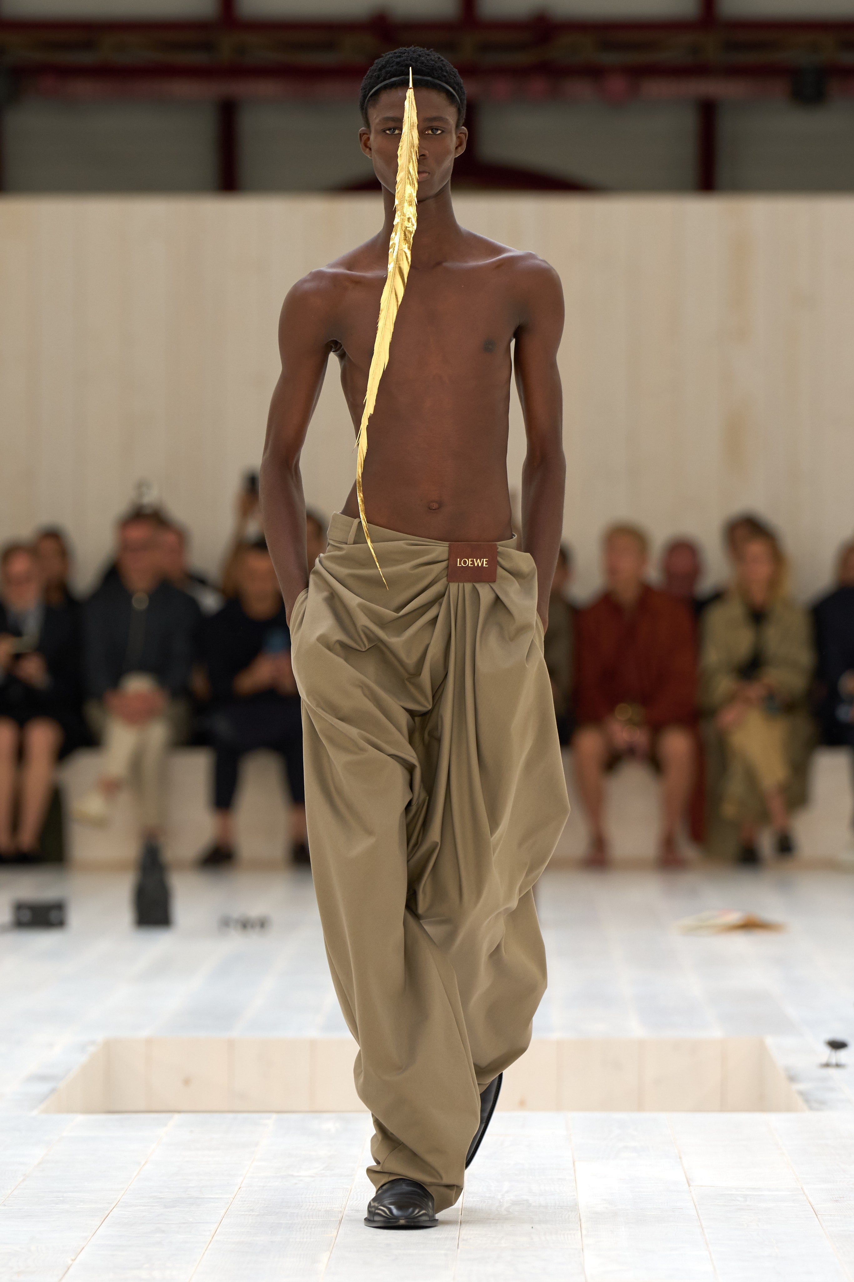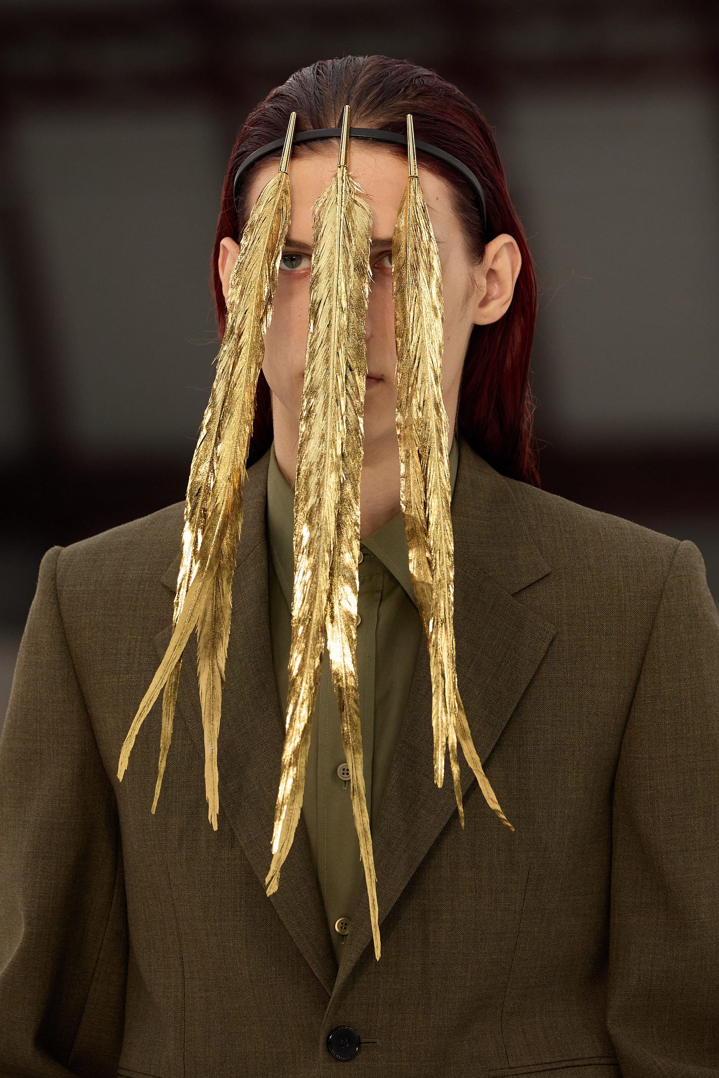 Ayo’s suit, however, is Loewe under the purview of Jonathan Anderson, who showed golden feathers on the runway in his Spring ‘24 menswear collection. Anderson said the “feathers were there to divide our view of the faces beneath them as part of his consideration of forced perspective,” according to Vogue.