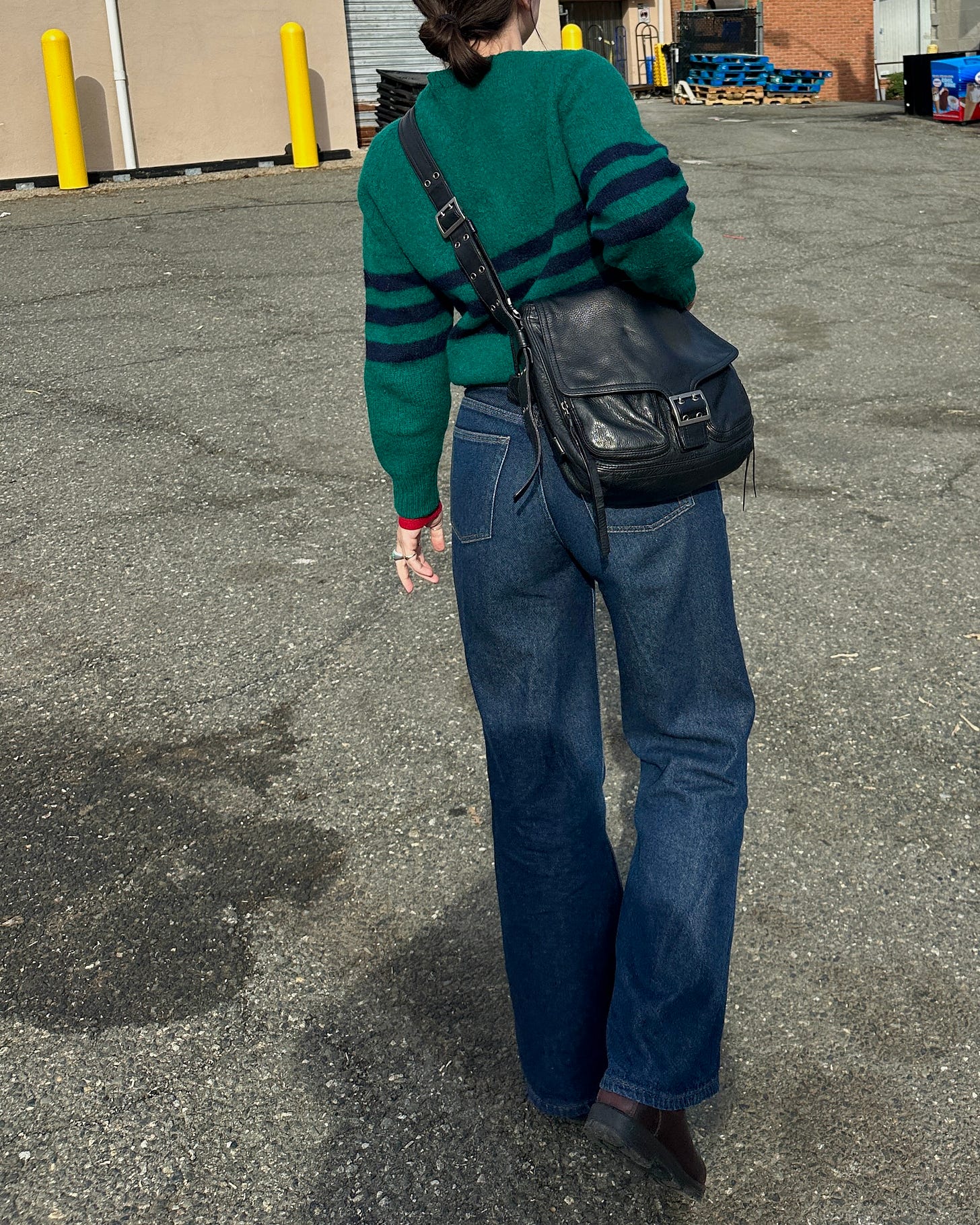 A black leather, silver-buckled messenger bag originally released in the fall of 2004. I submitted an offer on Depop for $33 — a risky move allowing time for someone to swoop in and buy it out from under me, but I respect the game too much not to send a lower offer. Thank GOD she accepted.