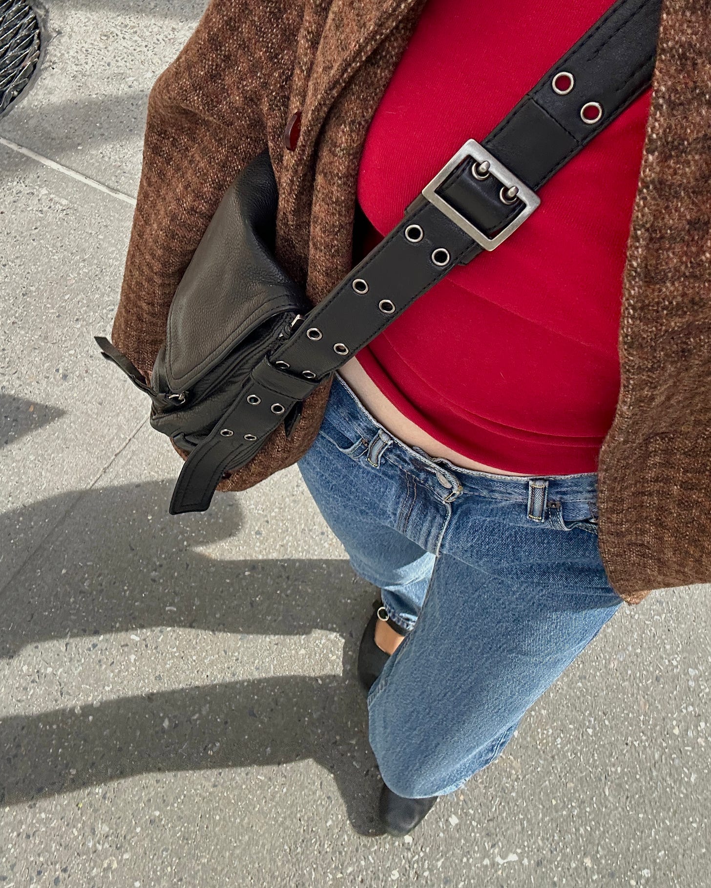 Crescent 2.0 — When the Collina Strada collab came out in spring of 2024, I snagged the plain black crescent. My reasoning: the strap was a higher quality, silkier material, and the big silver buckle made the bag feel more like me. It was a nice design touch, and I liked that bag a little bit more than the one before. I hated myself less when I wore it.