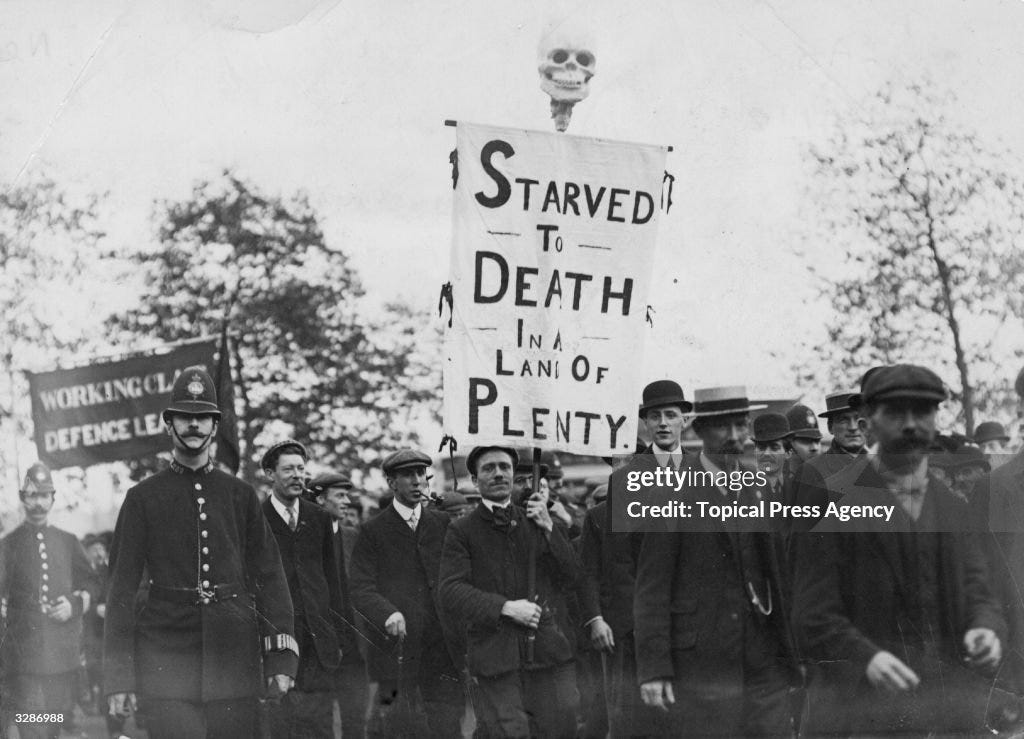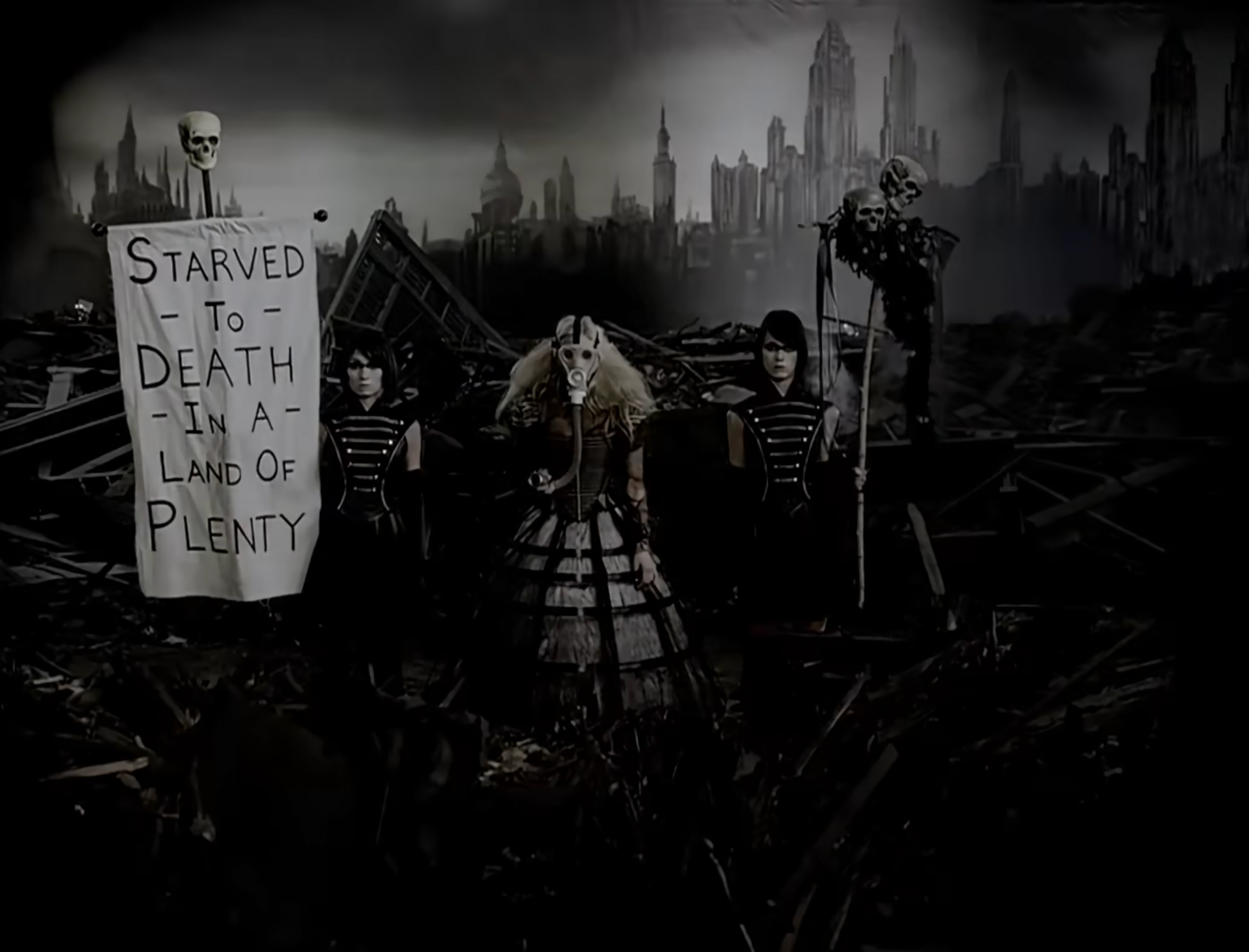 At one point during the “Welcome to the Black Parade” music video, a banner comes into frame that reads: Starved to death in a land of plenty. It’s a replica of a banner photographed at an unemployment protest in London in 1908.