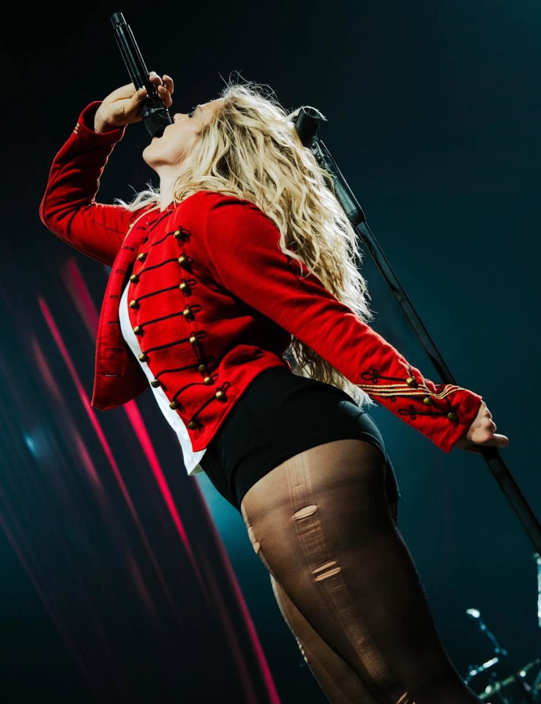 On stage, hugging the shoulders of a man with shaggy hair thrusting his hips to the beat, the jacket does anything but fit in. A uniform meant for someone who shuts up and follows orders finds subversion on someone who amplifies their voice to packed stadiums and writes their own rules.