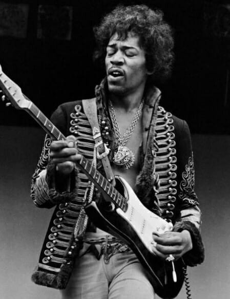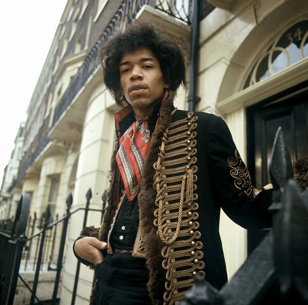 Hendrix, heavily influenced by the London rock scene and a massive fan of the Beatles, is said to have bought his iconic hussar jacket from the same Notting Hill vintage shop as Mick Jagger.