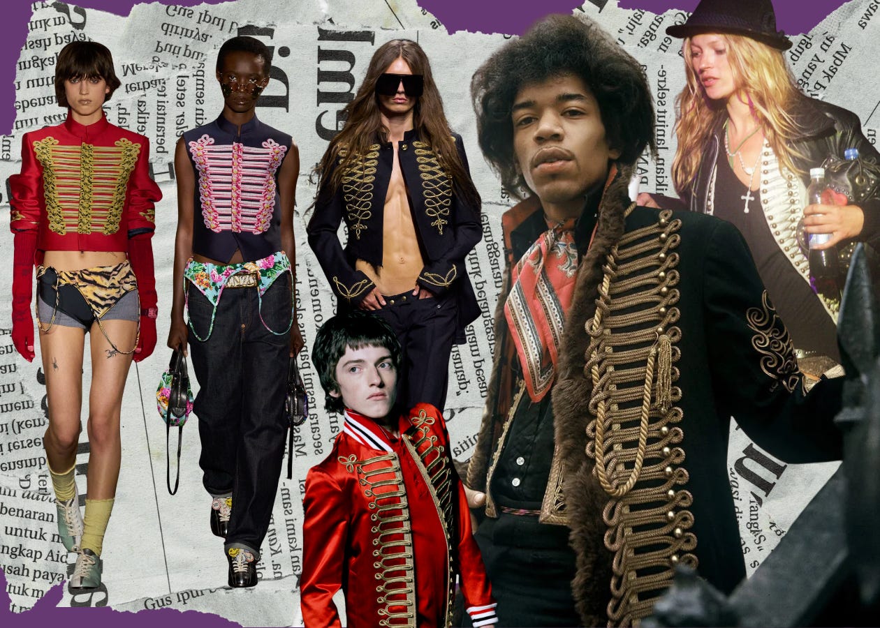 The Beatles wore their military uniforms not with regard for their queen’s troops but as a mockery. Hendrix didn’t don his jacket as a proud callback to his service but with irreverence for the systems that forced him there. The resurrection of the hussar jacket today points to a similar countercultural undercurrent.