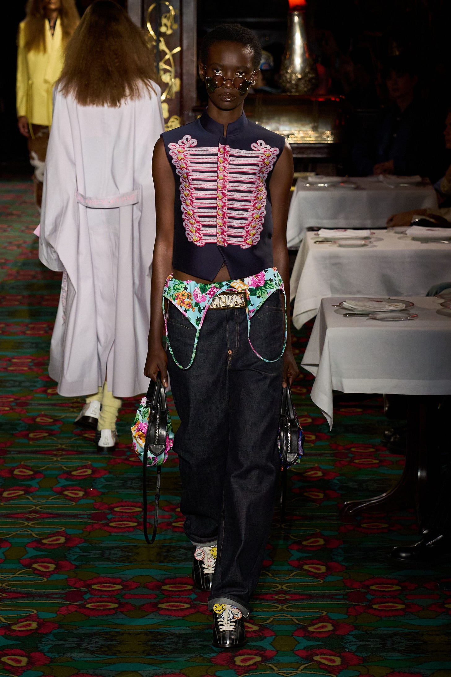 As we continue to yearn for something to scratch the dopamine itch — candy colors and loud patterns, bows fixed to everything, a pop of red in every corner — an ornately blinged and tasseled military jacket doesn’t feel out of place. In direct contrast to years we spent inside, this jacket marches forward and asks if you wanna do a line in the bathroom.