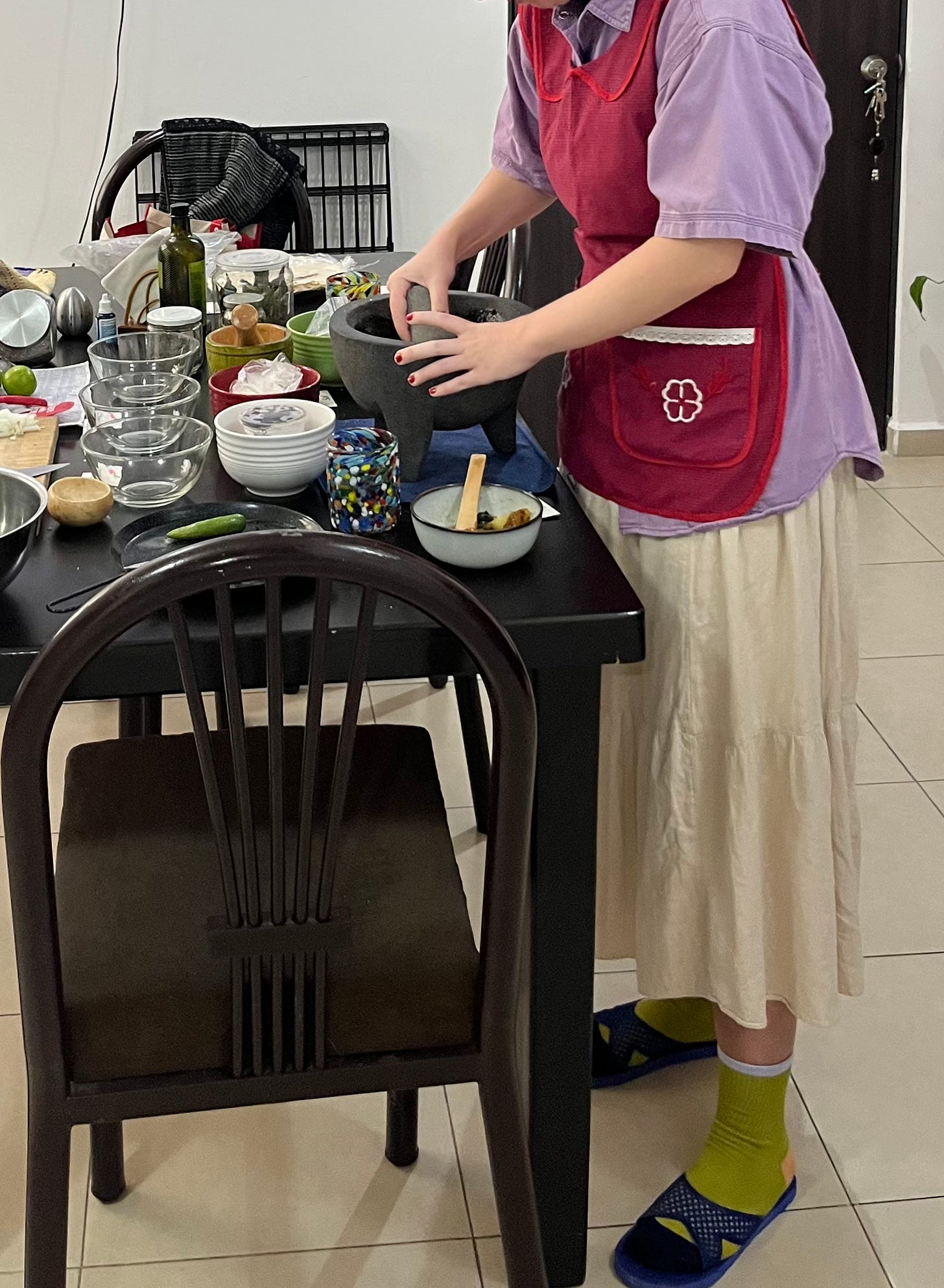 My outfit of the day was vastly improved with the help of our guide, who offered me an adorable apron and slides for the afternoon of cooking. Unfortunately the molcajete was far too heavy to bring home in the carry-on.