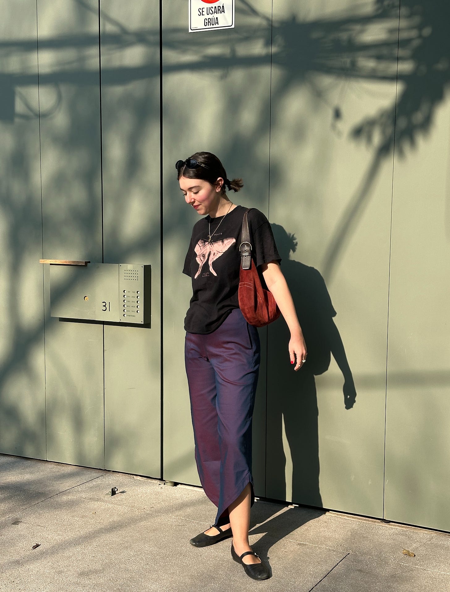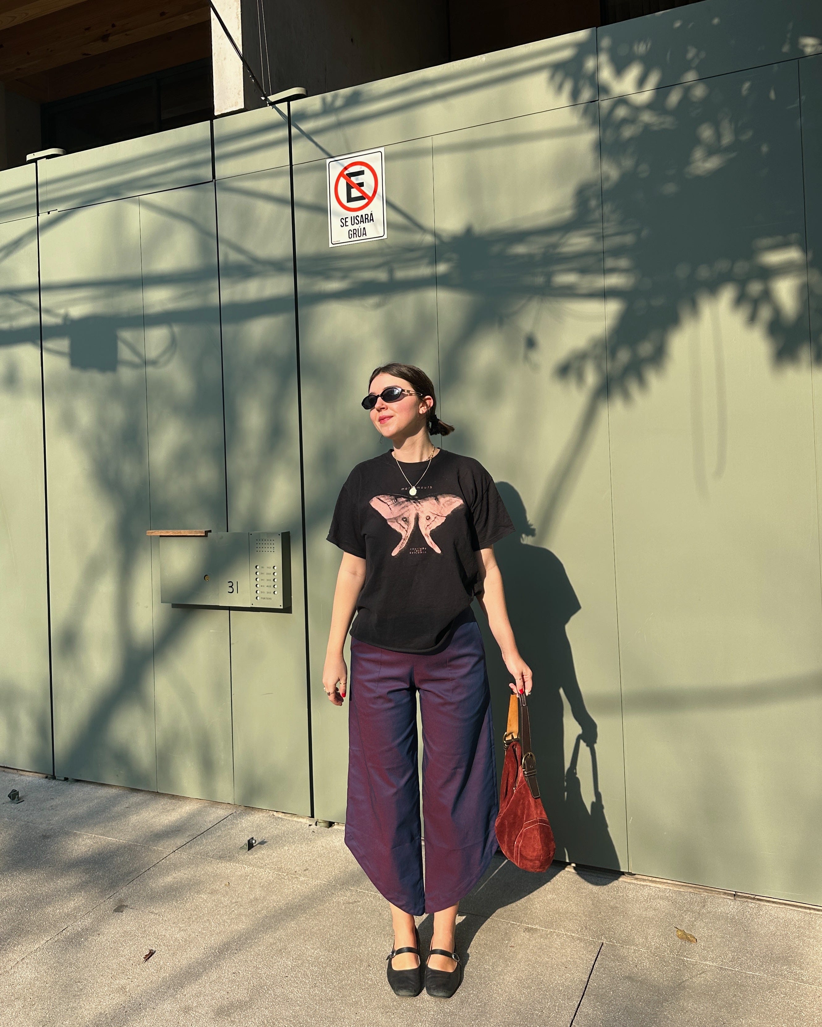 I was entranced by these bad boys in the Cihuah store right off of Calle Marsella. Interwoven red and blue blend together to create a purple effect in the duo-chrome-esque fabric — and they are the most perfect answer to my prayers regarding these sheets I was obsessed with last fall but couldn’t stomach the price of. The funky silhouette, a sort of wide leg kick flare that’s been sliced at an angle like in a game of Fruit Ninja, sealed the deal.