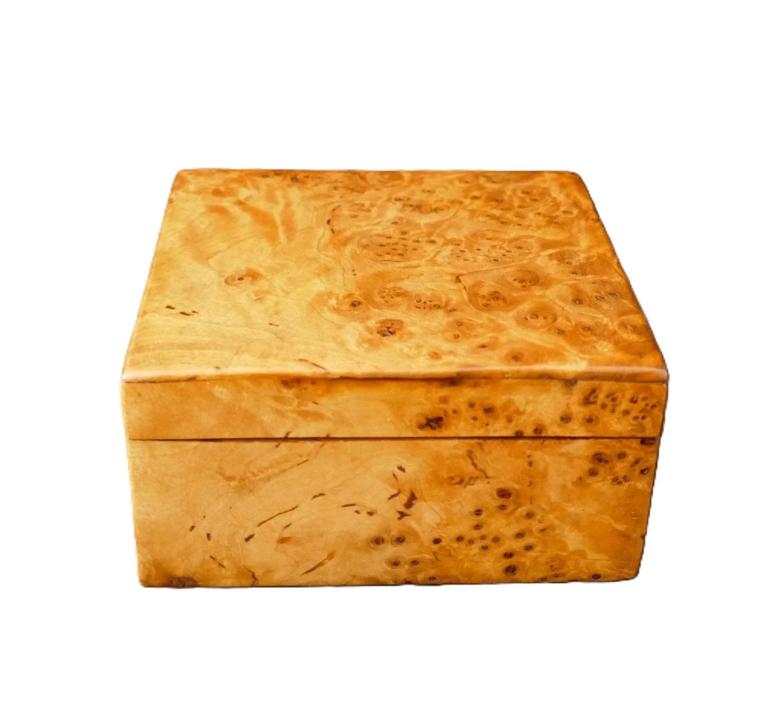 Vintage Siberian Elm Burl Wood Birdseye Jewelry Square Box, $90