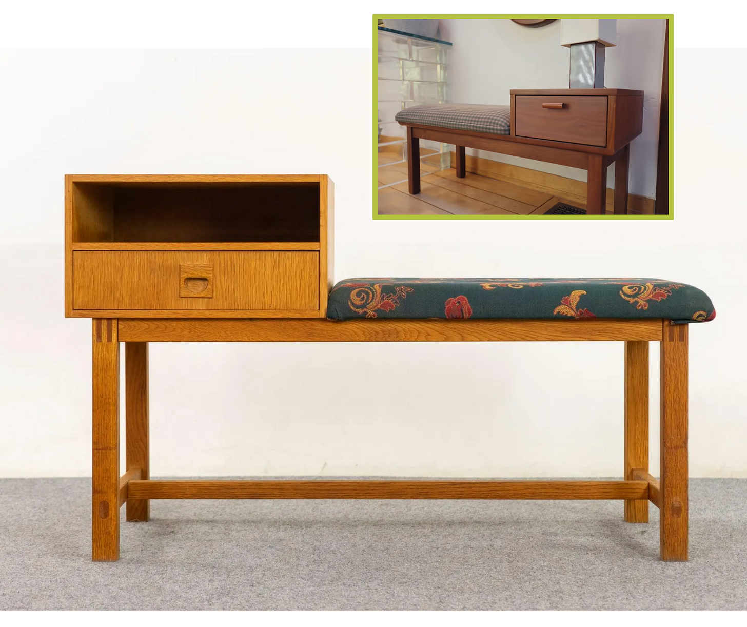 Oak Mid Century Gossip Bench, $859 (called a gossip bench because you used to keep the phone on the table and sit on the bench while talking shit with your friends!)
