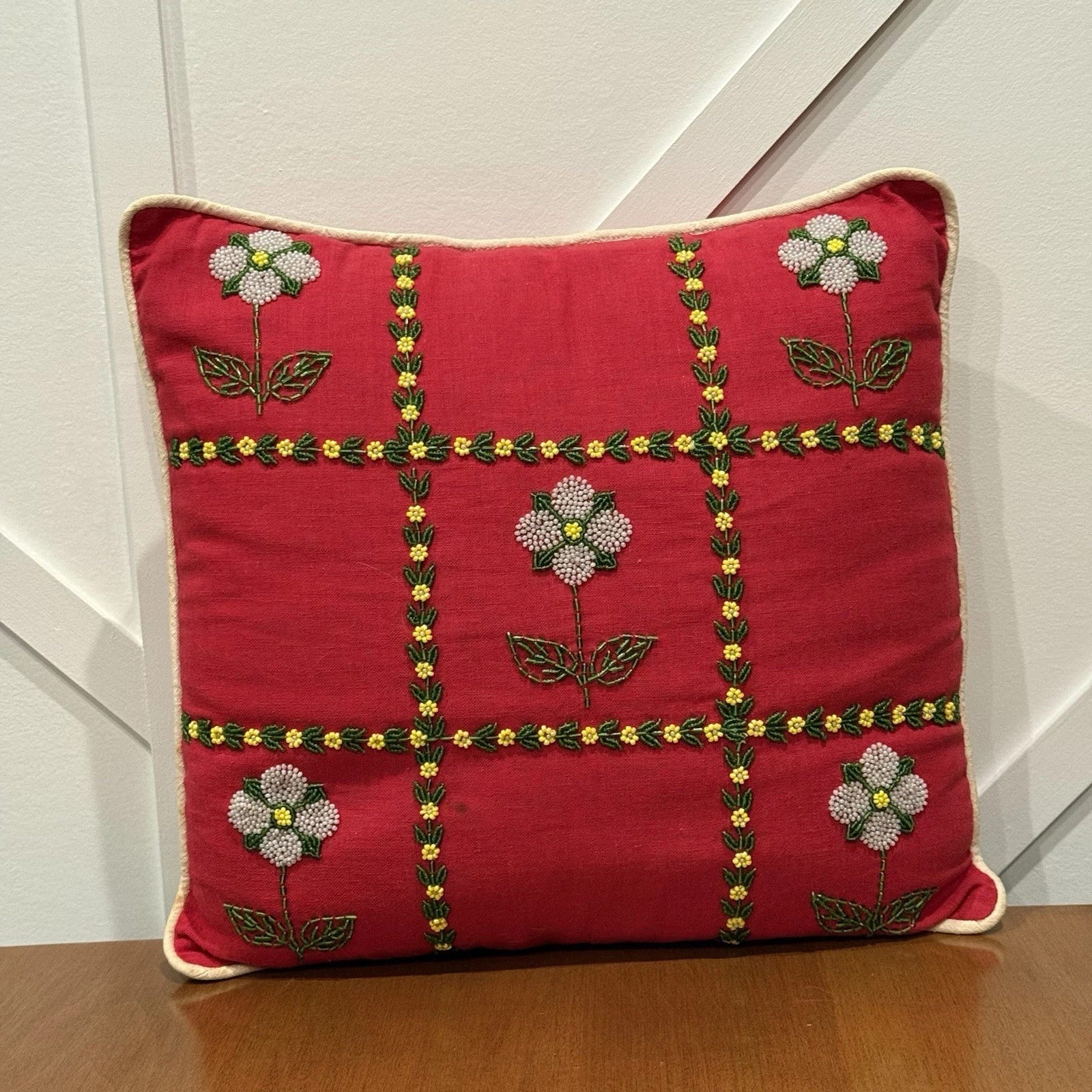 Vintage Handmade Small 11” Red Pillow Beaded Flowers Bead Embroidery, $12