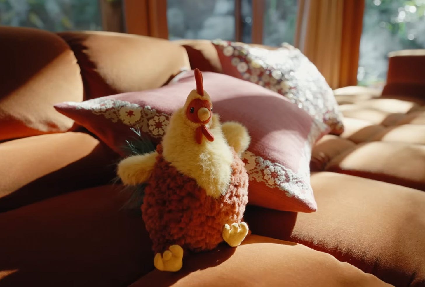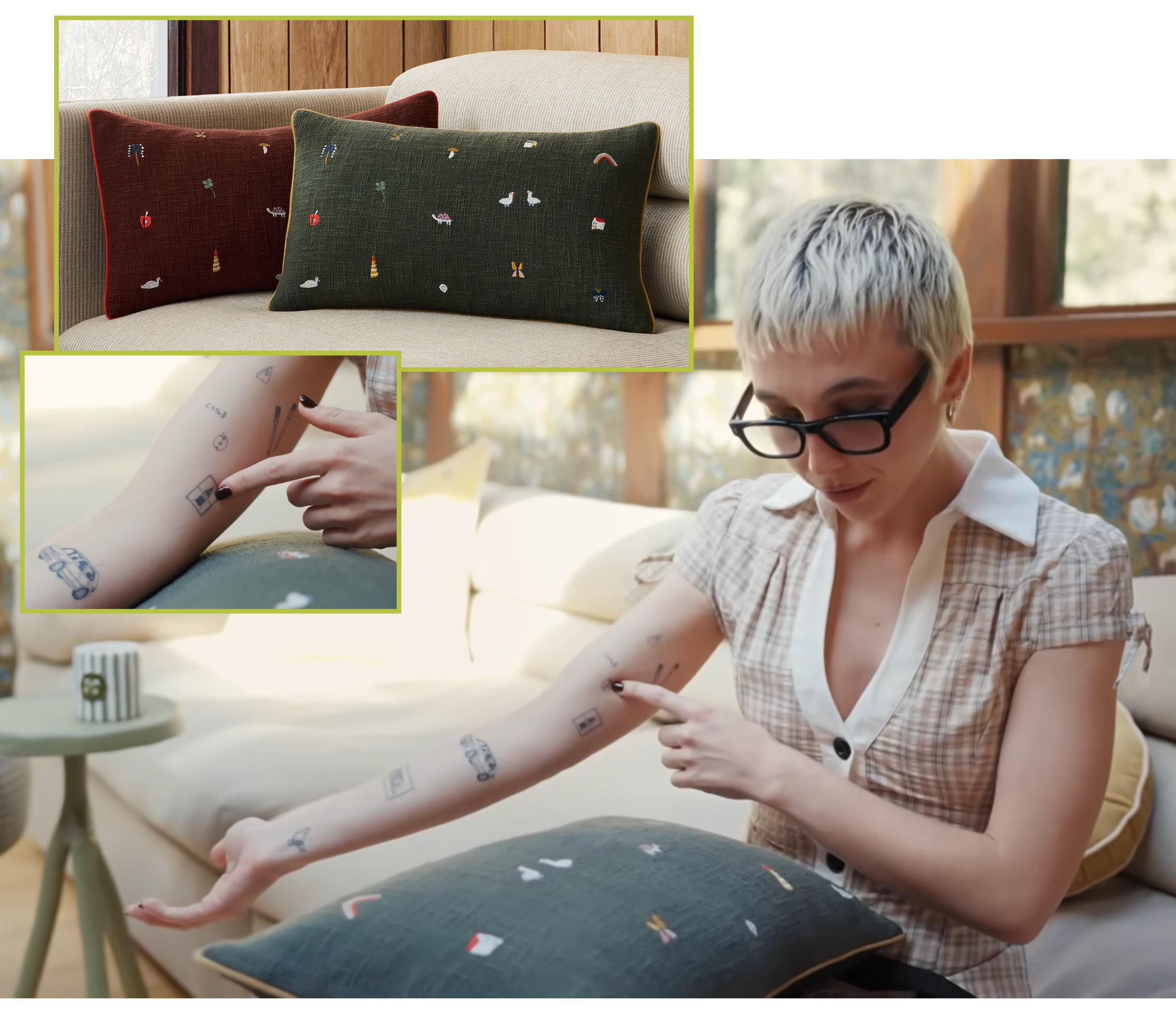 During a walk-through of her living room, she somewhat indirectly likens home decor to tattoos, sharing a throw pillow from the collab stitched with objects she has inked on her arms. There’s a mushroom, a turtle, some birds, and an apple, obviously.