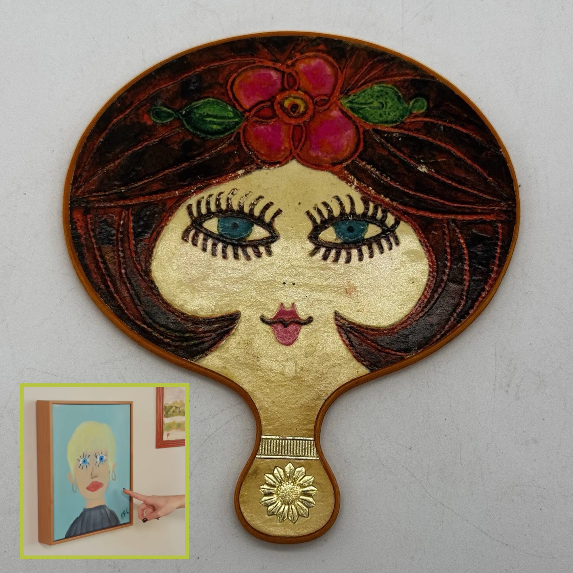Vintage 1960s Mod Big Blue Eye Girl Hand Mirror, $39