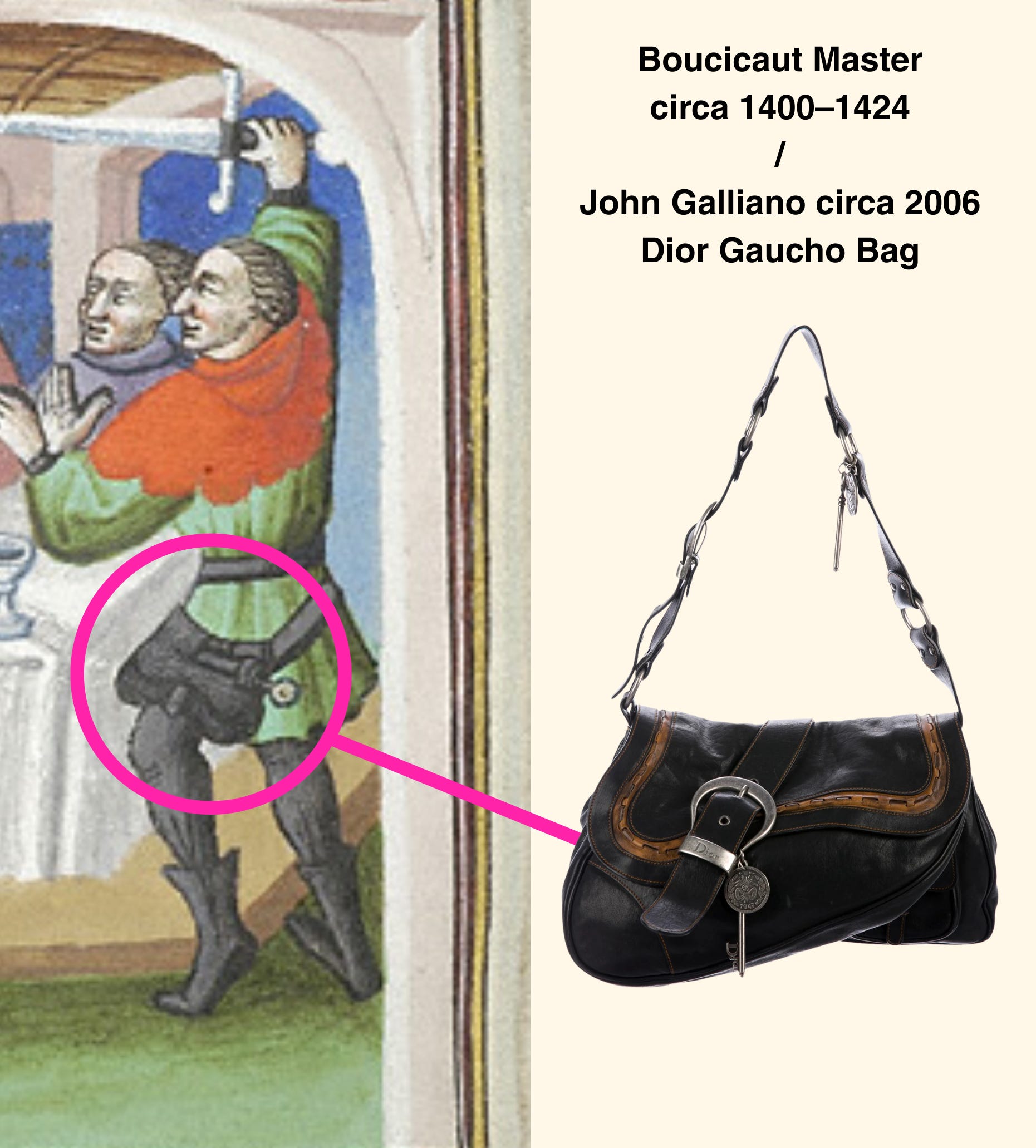 Peasants and shepherds wore purses in their day-to-day laboring4 while Henry V sported a pouch-belt made with gold valued at £65 — about the salary of a skilled tradesman for 300 days work in 1420 or, adjusted in today’s currency, nearly £4,000. (In 2025, Henry V would have his Hermes sales associate on call.)