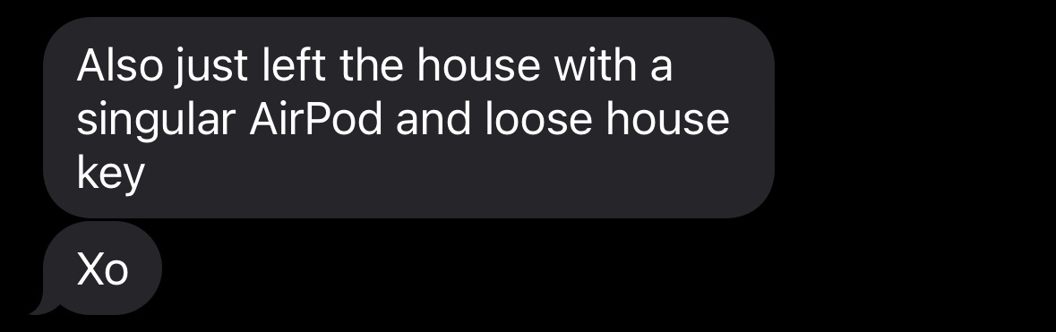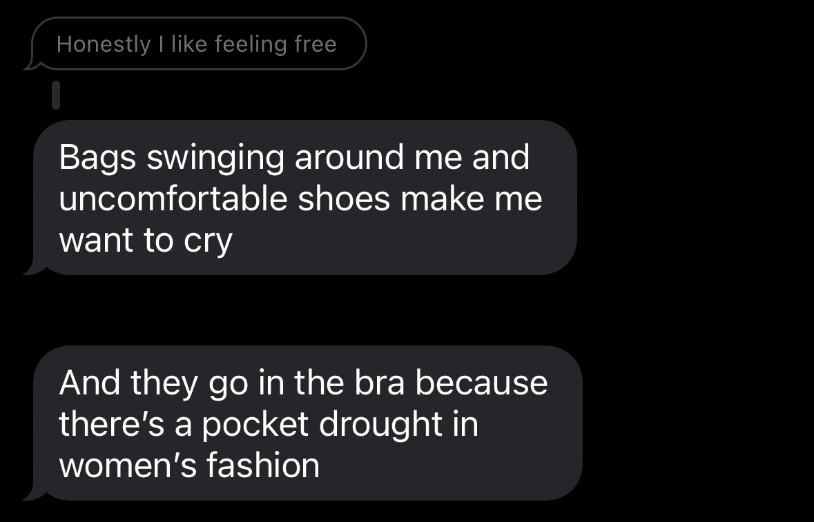 She forgoes any sort of bag altogether, even when an outfit doesn’t have pockets. Recently she met me for dinner in a baby tee and a cotton mini skirt, nothing close to a pocket in sight, and I had to beg her to let me carry the loose AirPods in my own bag. Sends shivers down my spine to even think about it.