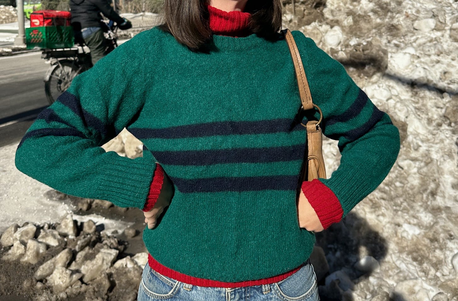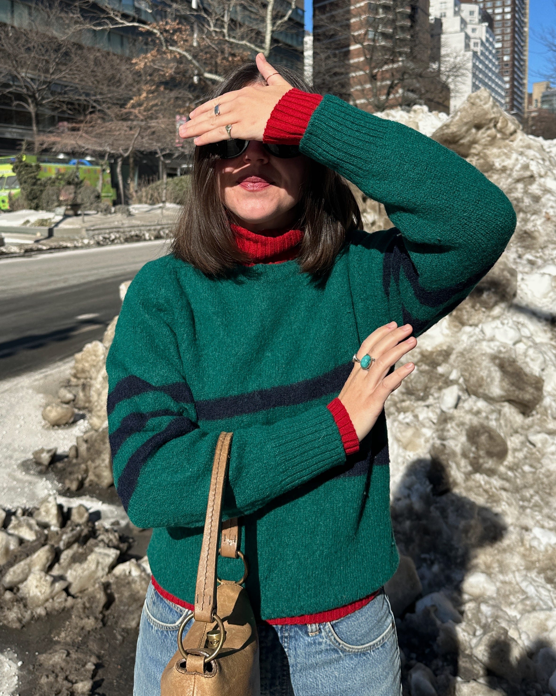 A few years ago while visiting my mom, I fished an ‘80s GAP shetland wool number out of a flea market $5 bin. A piece that pre-dates her work there and has a few charming little holes to show for it. Its varsity stripes and coarse ribbed cuffs make me feel like I’m studying for a classics exam in a snowed-in university library, Richard Papen style.