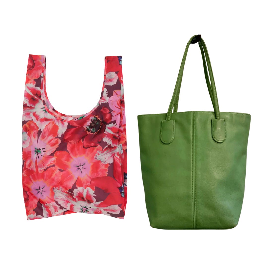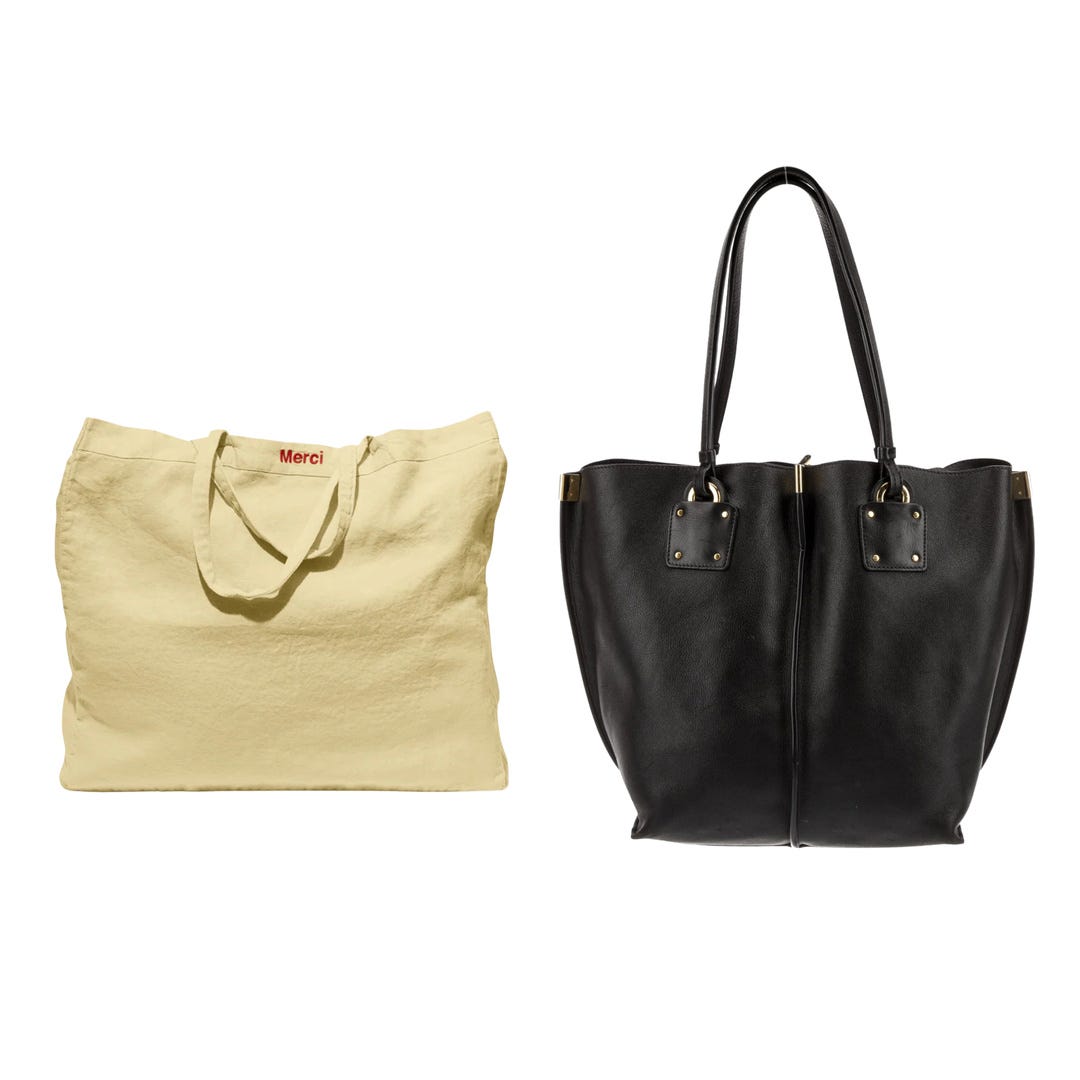 Inside, the chicken: a small reusable tote crumpled into a ball, maybe stuffed inside an even smaller tote carrying bag. The next layer, the duck: a medium-sized tote, probably linen or cotton, malleable enough to fold in on itself. On the outside, the turkey: a larger or more structured bag, something more presentable, most likely, that goes better with the outfit or feels work appropriate.