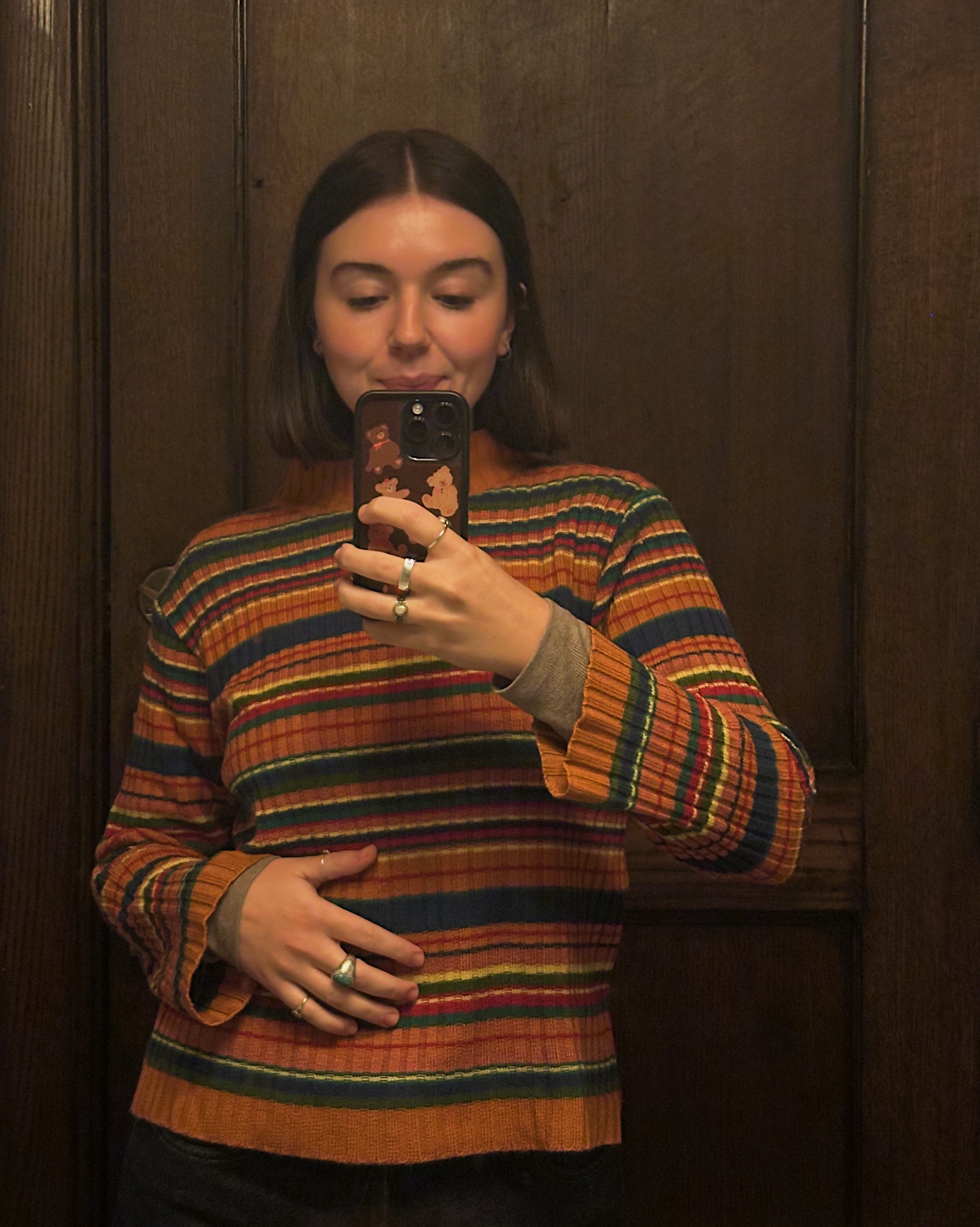 It’s ‘70s vintage, made of an acrylic wool blend in a ribbed texture, with a rainbow-ish array of stripes speeding horizontally across the knit in varying weights. It’s itchy and the mock neck is oddly wide and I felt an instant connection when I spotted it at a thrift store years ago.